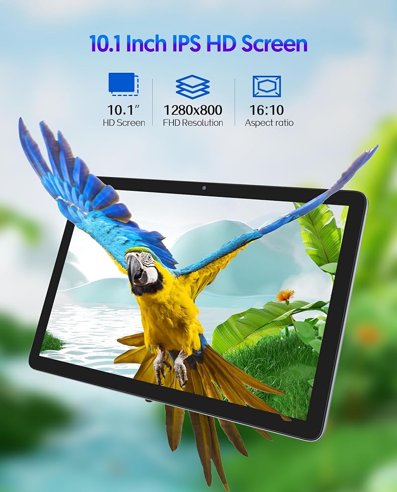 HD DISPLAY WITH EYES PROTECTION - This 10.1 inch android tablet computer has an ultra-clear LCD screen, 1280x800 narrow-edge screen professional design, equipped with 2MP+8MP dual high-definition cameras, presenting you with richer picture display, clearer portrait capture, more delicate detail depiction, large screen Soft light curtain can reduce the visual pressure on your eyes and relieve fatigue