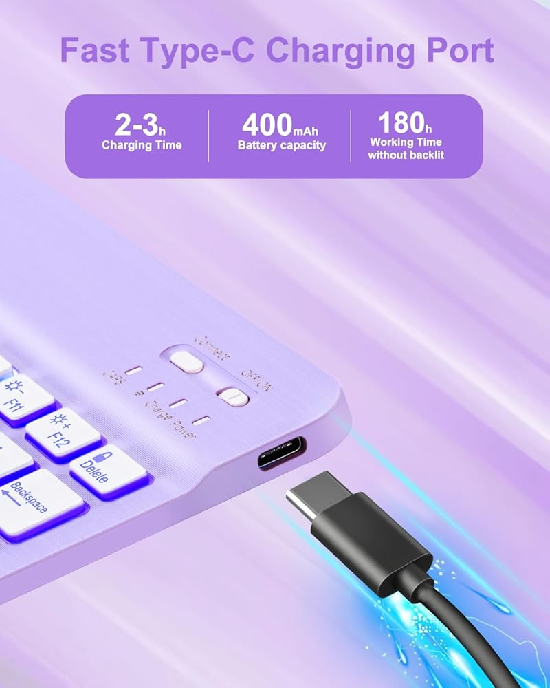 【Rechargeable Keyboard, Long-Lasting Battery Life】This keyboard has a built-in 400 mAh lithium battery, which charges for 2-3 hours and can work continuously for up to 50 hours under normal use (without backlit ),which will automatically enter sleep mode when not used for a long time to save power, and click any key to instantly the wake-up.Standby state lasts up to 90 days,which is very friendly for travel and mobile office