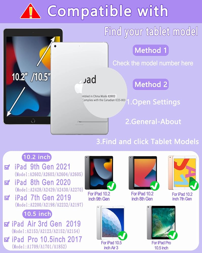 【Compatible Models】This keyboard case is only compatible with iPad 7th/8th/9th generation (Model: A2200 A2198 A2197 A2232 A2428 A2429 A2430 A2270 A2602 A2603 A2604 A2605), iPad air 3rd generation 10.5 inch (A2123 A2152 A2153 A2154), iPad Pro 10.5 inch (A1701 A1709). Before purchasing, please check the model number of "AXXXX" on the back of iPad. "Axxx". (This product does not include: tablet, pencil)