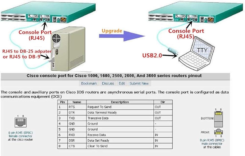 USB to RJ45 console cable, connects to any USB port on your laptop directly to a Cisco console port. No adapters needed. It is for Cisco console port for Cisco 1000, 1600, 2500, 2600, 3600 series routers, Catalyst 3560 switch pinout, and more