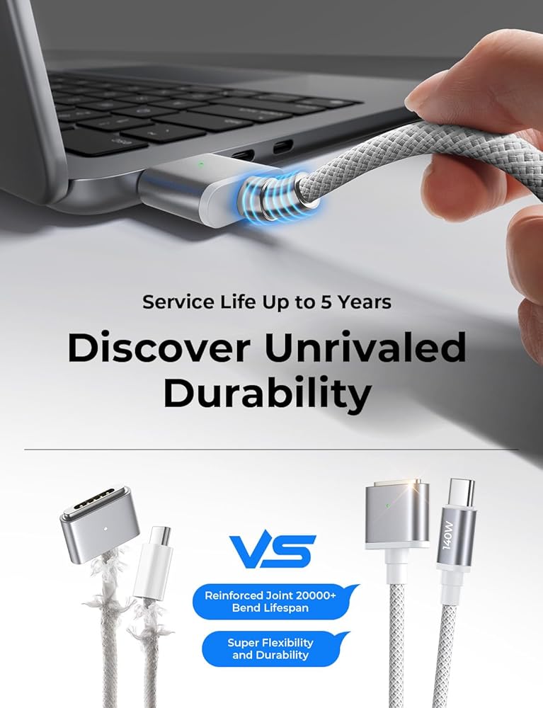STRONG MAGNETIC SUCTION CHARGING: This Gen3 Macbook Cable uses strong magnetic suction to hold the charger securely in place while charging a MacBook. This can help to protect the MacBook by preventing the charger from becoming disconnected or falling out while it is in use