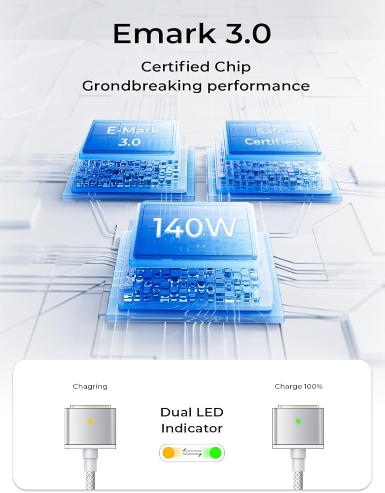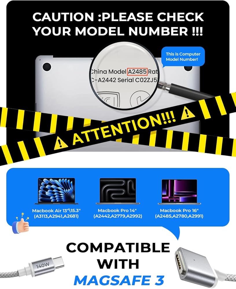 COMPATIBLE WITH MACBOOK:This USB-C to Magnetic 3 Cable only Compatible with MacBook Pro(14-inch, M2, 2023), MacBook Pro (16-inch, M2, 2023), MacBook Air (M2, 2022), MacBook Pro (14-inch, 2021), MacBook Pro (16-inch, 2021), A2779, A2780, A2681, A2442, A2485. Please check your Macbook Model and choose the right one