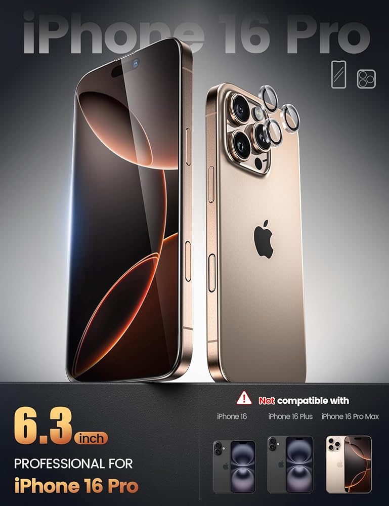 【Perfect for iPhone 16 Pro】The iPhone 16 Pro Screen Protector and Camera Lens Protector are designed for the iPhone 16 Pro. It's prefectly fot for iPhone 16 Pro & its black edge blends perfectly with iPhone's black frame without affecting appearance. Included: 2 pcs of iPhone 16 Pro glass screen protector+ 2 pcs of camera tempered glass protector + 1 set of installing kit (Aligned frame, film scrapper, cleaning tool.)