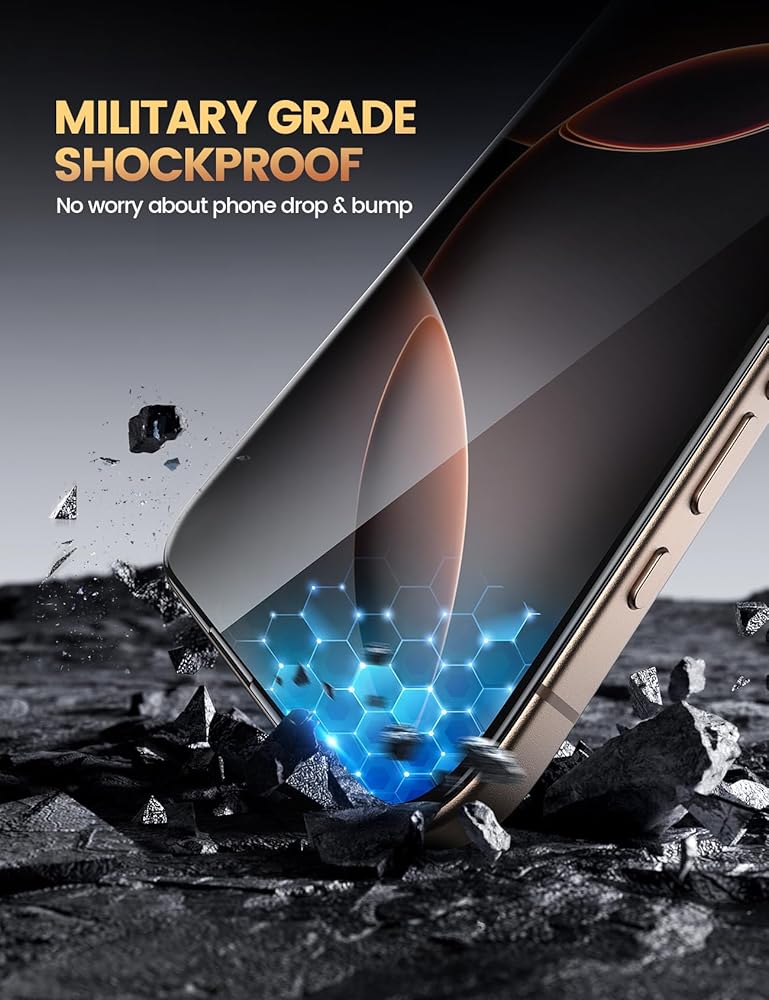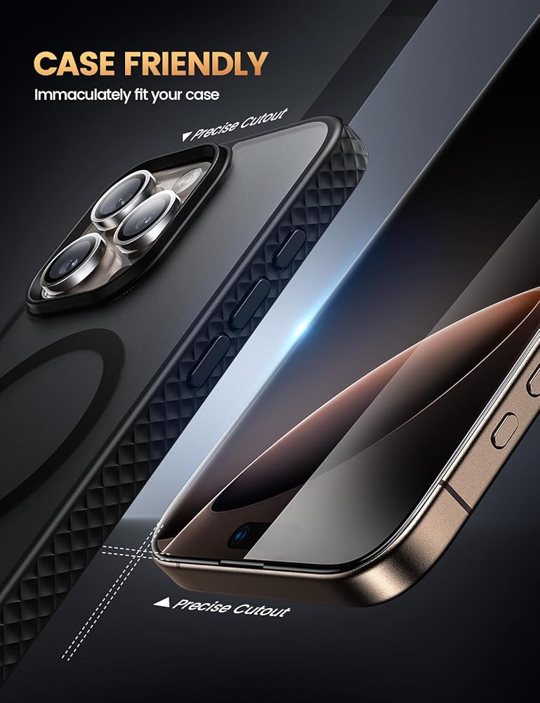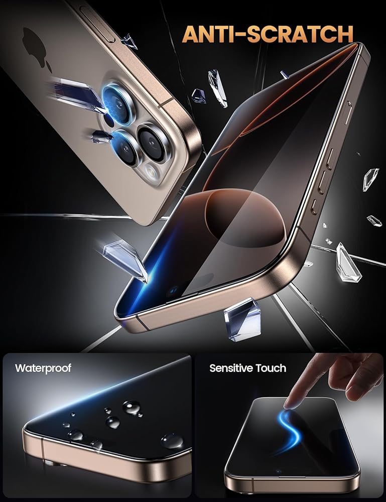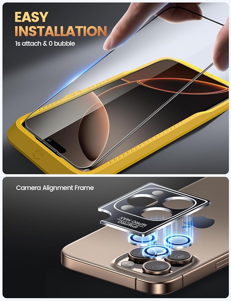 【Easy Installation & 0 Bubbles】Aligned frame and unique static auto-suction tech ensure quick, easy and bubble-free installation. A 0.8mm PC backing prevents the screen protector for iPhone 16 Pro from bending and distorting, ensures a perfect fit. And the included film scrapper will help you to eleminate bubbles. !!! Please read the user manual and installation video carefully before installation.