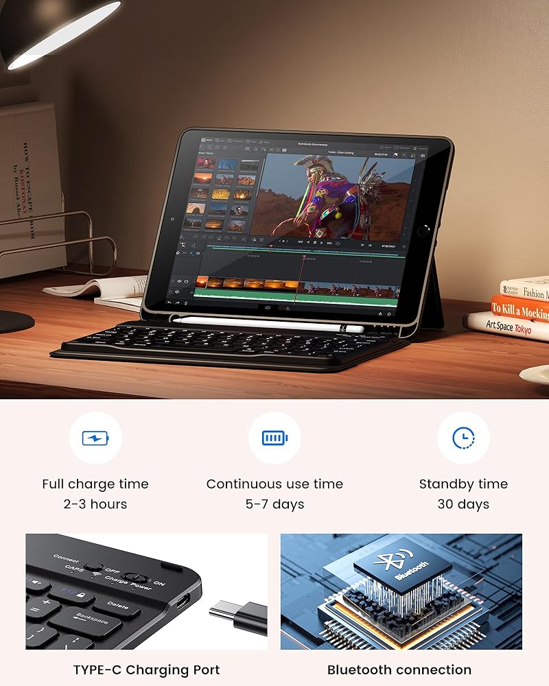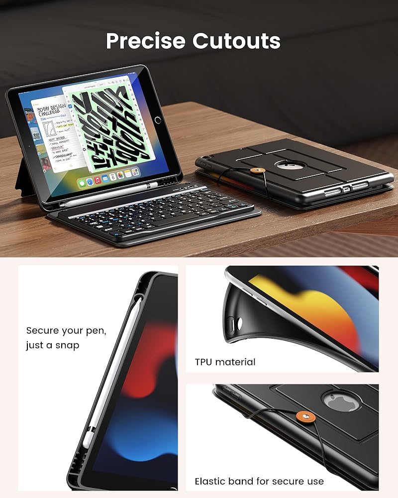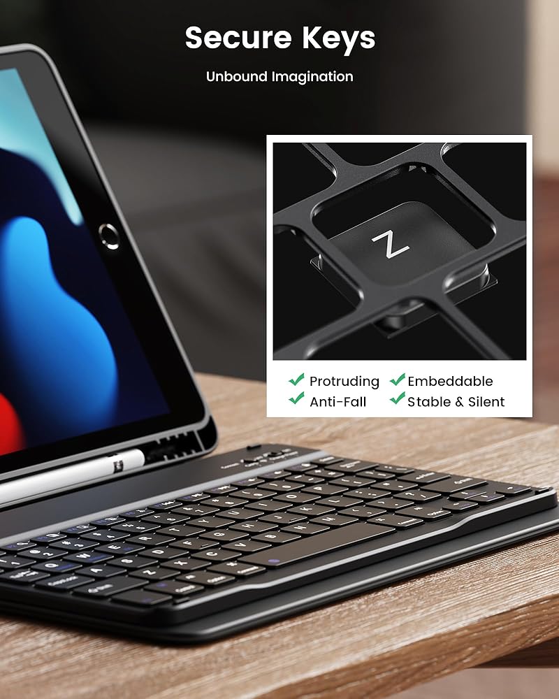 Secure pencil holder design: This iPad 9th/8th/7th generation keyboard case features a secure pencil holder design, which conveniently stores your Apple Pencil and prevents it from being lost or damaged