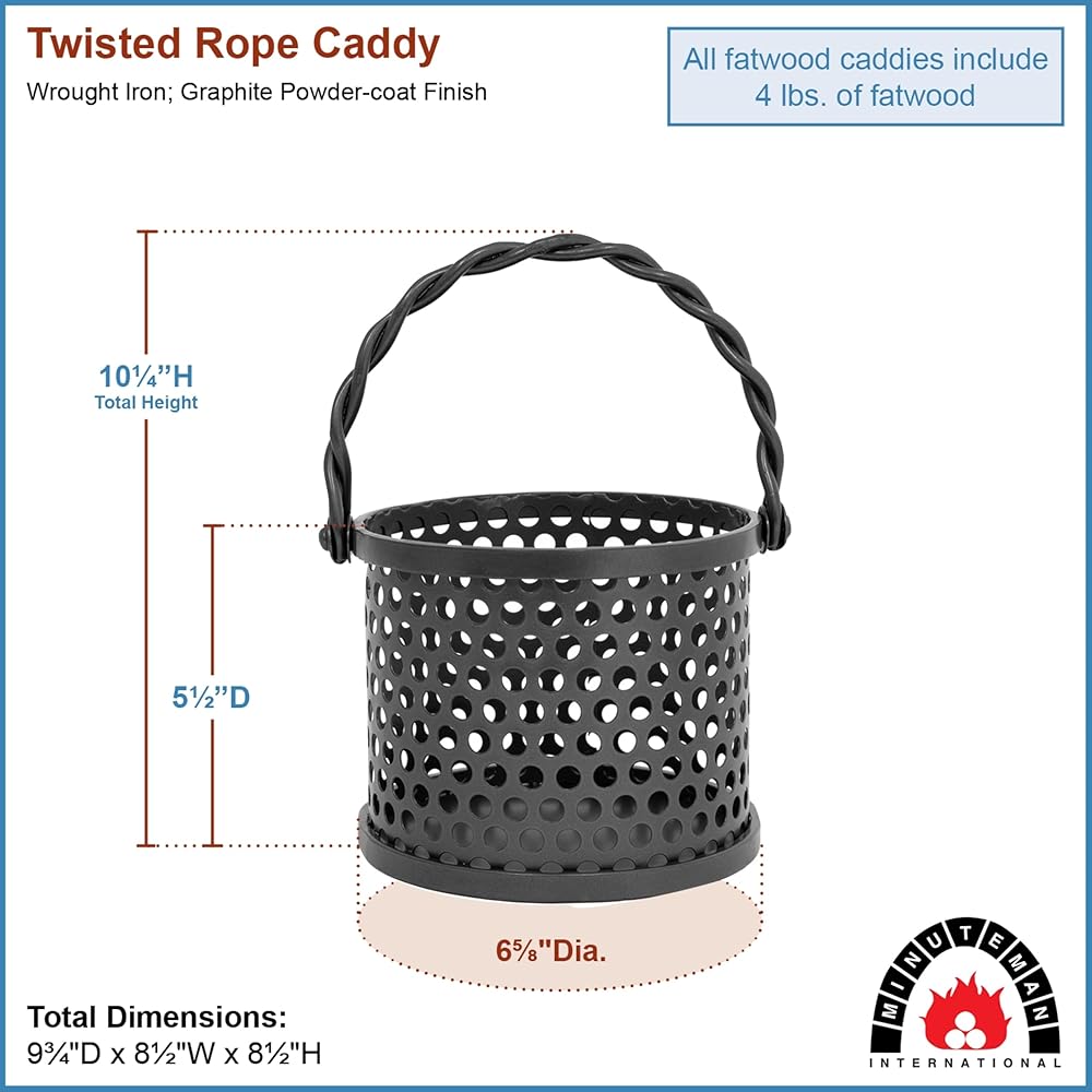 Fatwood fire starting sticks are a safe and natural alternative to chemical starters. Our Twisted Rope Fatwood Caddy has a traditional look and convenient basket for storing your fatwood. Four pounds of fatwood are included in this neat package. Pair it with our Minuteman International Twisted Rope Match Holder and other items from our full line of traditional wrought iron fireplace and hearth accessories.