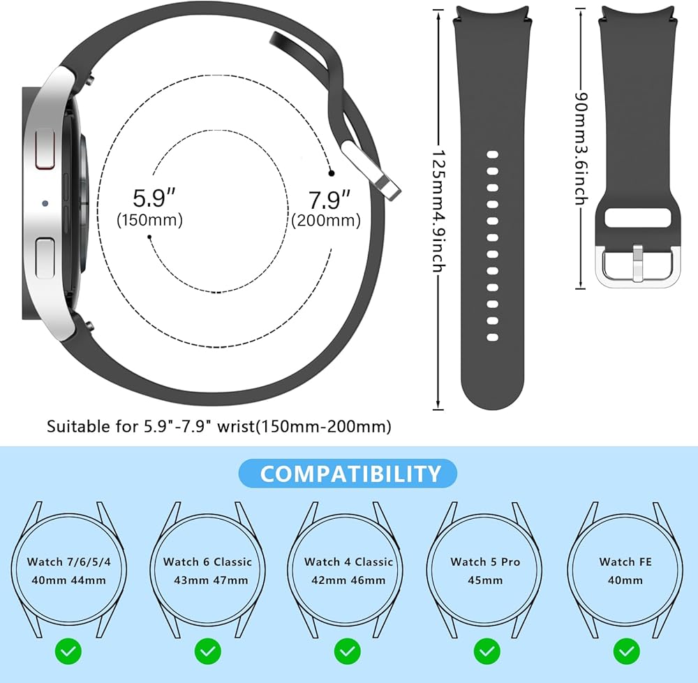 【Compatibility】:Compatible for Samsung Galaxy Watch 7 40mm 44mm/Watch FE 40mm/Watch 6 40mm 44mm/Watch 6 Classic 43mm 47mm/Watch 4 40mm 44mm/Watch 4 Classic 42mm 46mm/Watch 5 40mm 44mm/Watch 5 Pro 45mm. Fits wrist sizes 5.9"-7.9". Please check your watch model before purchasing.
