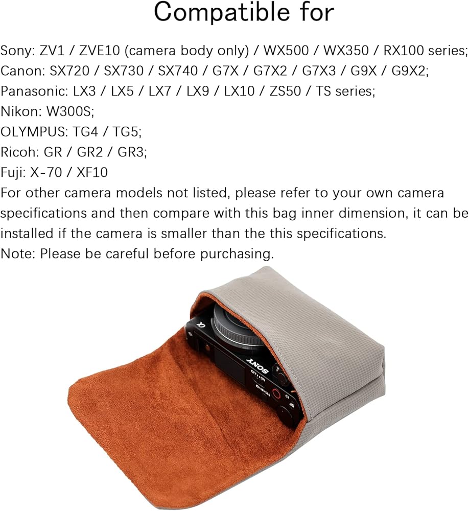 Compatible for Sony: ZV1 / ZVE10 (camera body only) / WX500 / WX350 / RX100 series; Canon: SX720 / SX730 / SX740 / G7X / G7X2 / G7X3 / G9X / G9X2; Panasonic: LX3 / LX5 / LX7 / LX9 / LX10 / ZS50 / TS series; Nikon: W300S; OLYMPUS: TG4 / TG5; Ricoh: GR / GR2 / GR3; Fuji: X-70 / XF10 and more cameras with similar sizes.