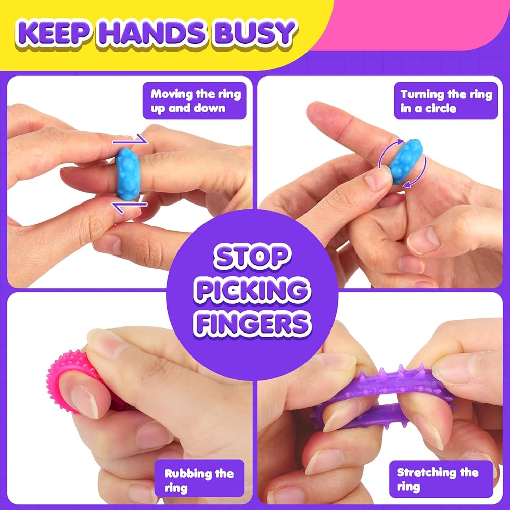 CHILD SAFETY IS A PRIORITY:These finger fidget calming toys are made from soft premium-quality and stretchy rubber material. Safe, durable, and stretchy. Suitable size and flexible design make it comfortable to wear. These fidget toy anxiety rings will not become loose like others after stretching. Best fidgets finger fings for kids, teens, boys, and girls who had serious issues with skin picking for years