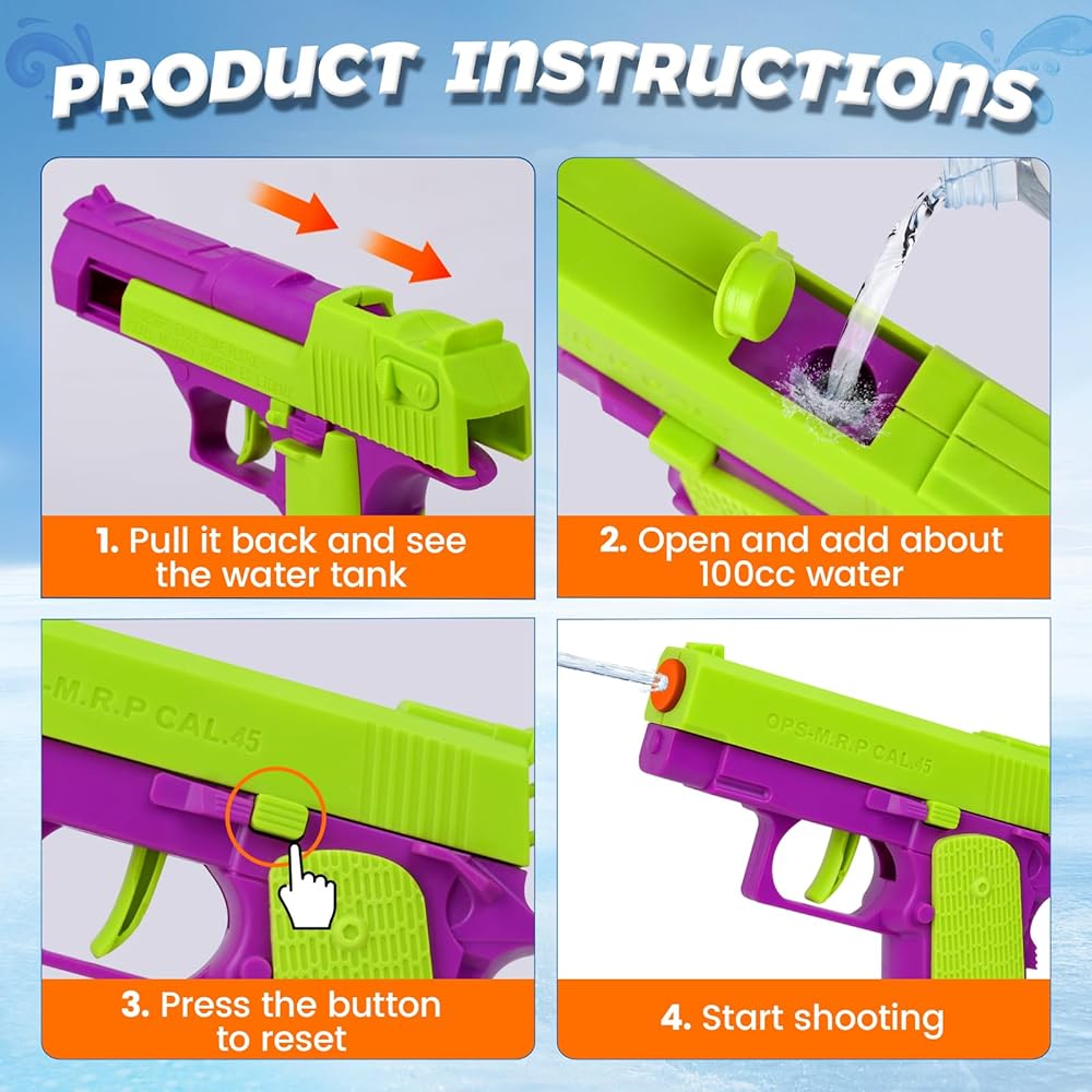 【Super Quick Refill Water Gun】- This water gun is easy to shoot, No Batteries Needed. Just pull back and open the top cover, fill it with water, reset, and squeeze the trigger to ignite the fun. You can also use these water blasters to discourage naughty behavior in pets without harming them.