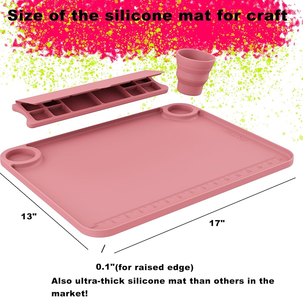 【Spacious & Protective】: The Silicone mat for crafts measuring 17X13 inches with raised edges, this mat provides ample space for your creative endeavors while preventing liquid spillage and messes. Plus, the silicone edge ensures your comfort by avoiding elbow discomfort during extended use. Ideal for painting, crafting, and other artistic activities.