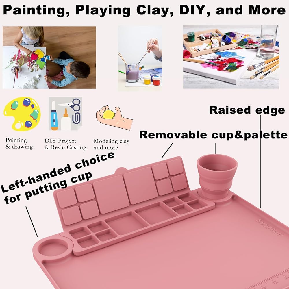 【Organized & Versatile】: The silicone painting station for kids equipped with a cup holder and various-sized wells to hold pigments or small items, this mat keeps your supplies neatly organized for hassle-free crafting sessions. Great for keeping paints, brushes, and other tools within easy reach.