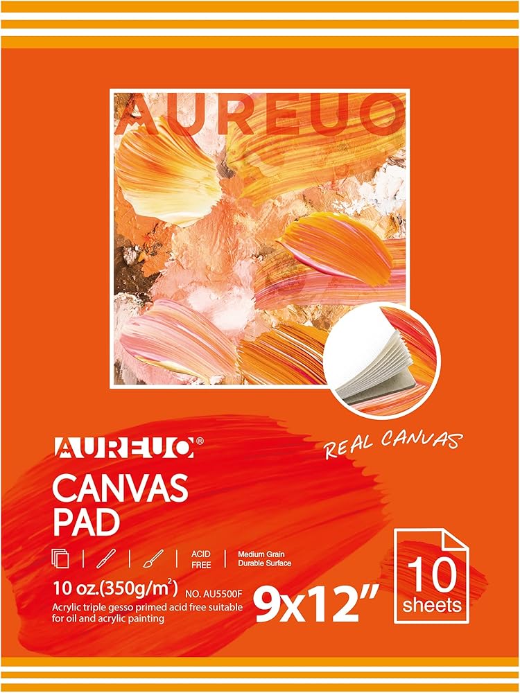 AUREUO Canvas Pad for Painting 10 Sheets, 10 Oz. - 9x12 Inch, 1 Pack - Triple Primed Glue Bound Cotton Canvas Paper for Oil and Acrylic Paints Art Supply for Mixed Media Painting