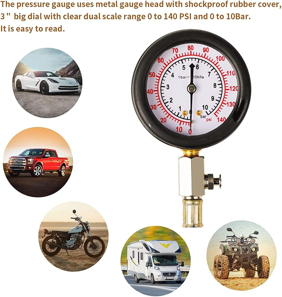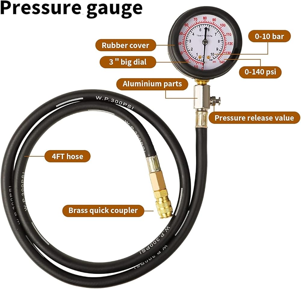 Exquisite design: Oil Pressure Tester Tool have dual display pressure gauge head, clear scale, easy to clean, and equipped with rubber buffer protection cover, shockproof and scratchproof.
