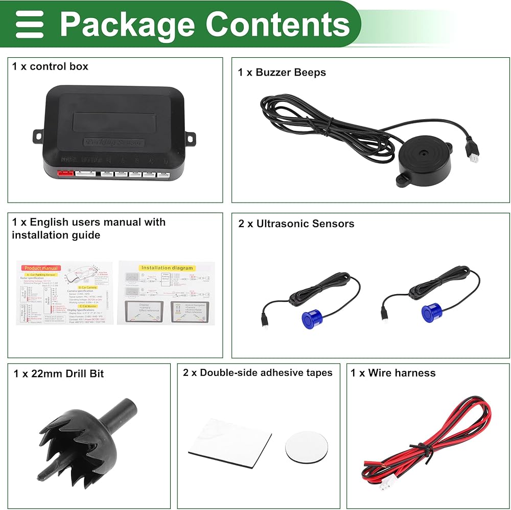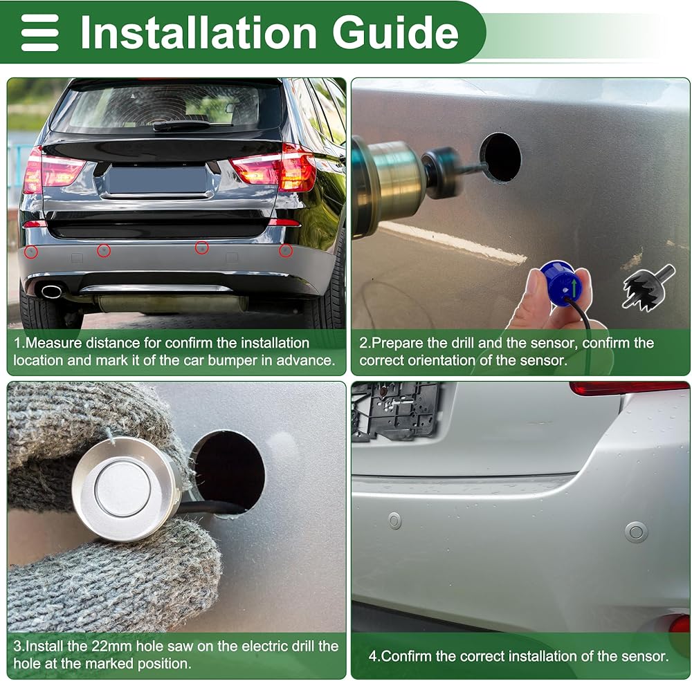 The parking sensor kit includes a 22mm drill bit for easy bumper installation. No need for additional tools. Follow the illustrated installation manual for a quick setup.