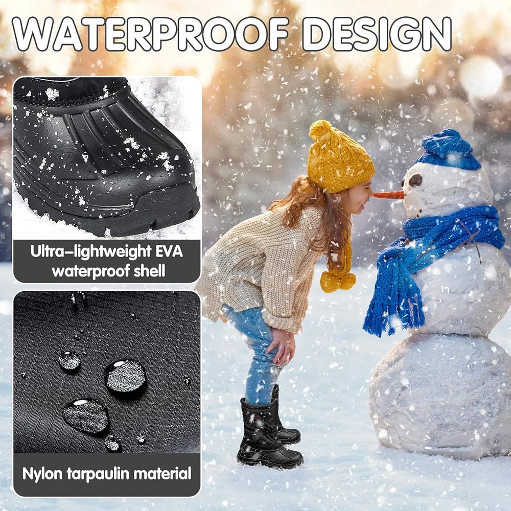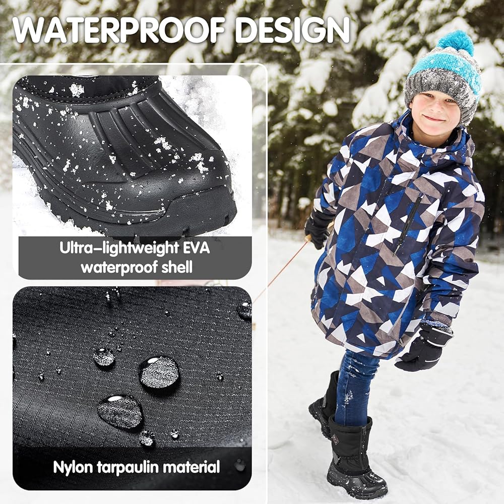 ULTRA-LIGHTWEIGHT EVA WATERPROOF SHELL:This boy's winter snow boot is made with a super-light EVA shell and nylon waterproof upper, providing double protection to easily block rain and snow. The sole is made of flexible but sturdy rubber, so it also can be used as a rain boot. The snow boots are lightweight and protective, allowing kids to run freely in snowy and damp conditions