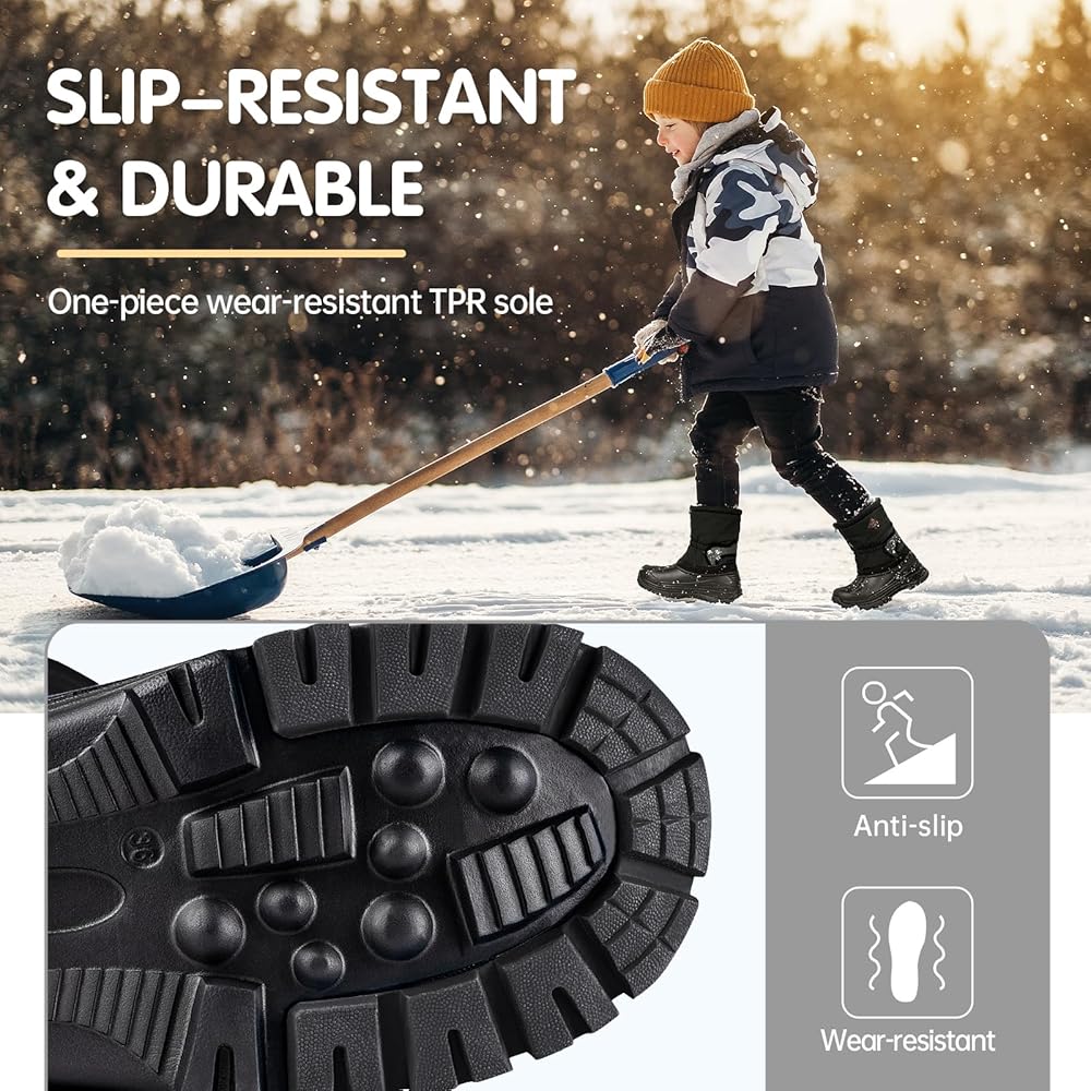 WEAR RESISTANT TPR OUTSOLE: The bottom of the boys' snow boots is made of high-density TPR material, sturdy and non-slip, enhancing grip and making them wear-resistant and non-slip for daily wear. Snow boots for boys with EVA-MD soles are thick but not stiff, with high elasticity and shock absorption, enhancing comfort and providing a more comfortable wearing experience. The lightweight design ensures that children can walk freely, allowing them to run freely and enjoy the winter fun