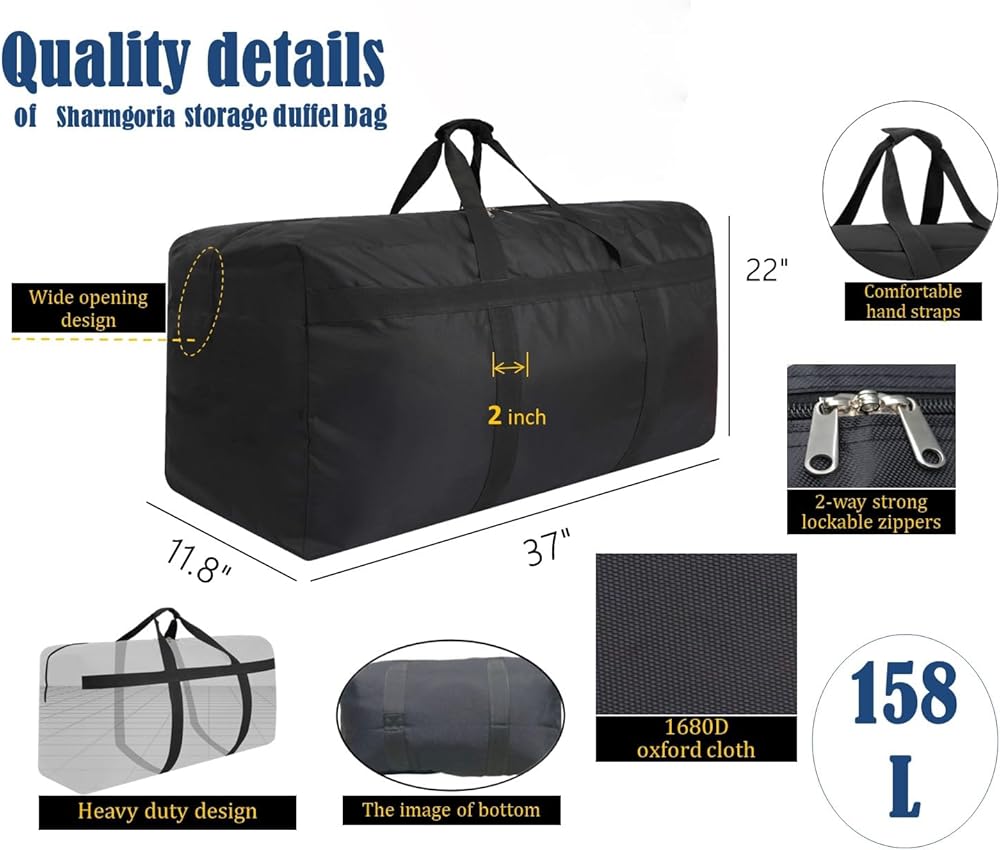 【Sturdy and Reliable】our big duffle bags are made of quality 1680D oxford cloth, it's physical property are better than other normal 600D or lower grade materials totally; thickened and widened webbing (2 inch width); tight stitching, the handles and straps have been reinforced by double stitched, it can held up carrying your travel items totally, they will not rip apart even overload; two-way strong lockable zippers well made and opens and closes smoothly, no worries about it coming apart when being carried