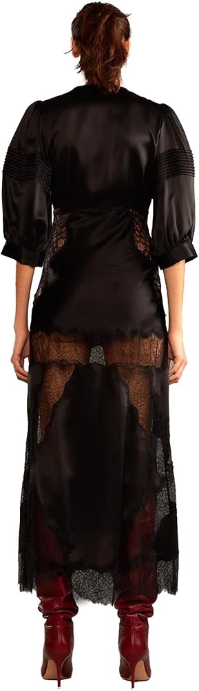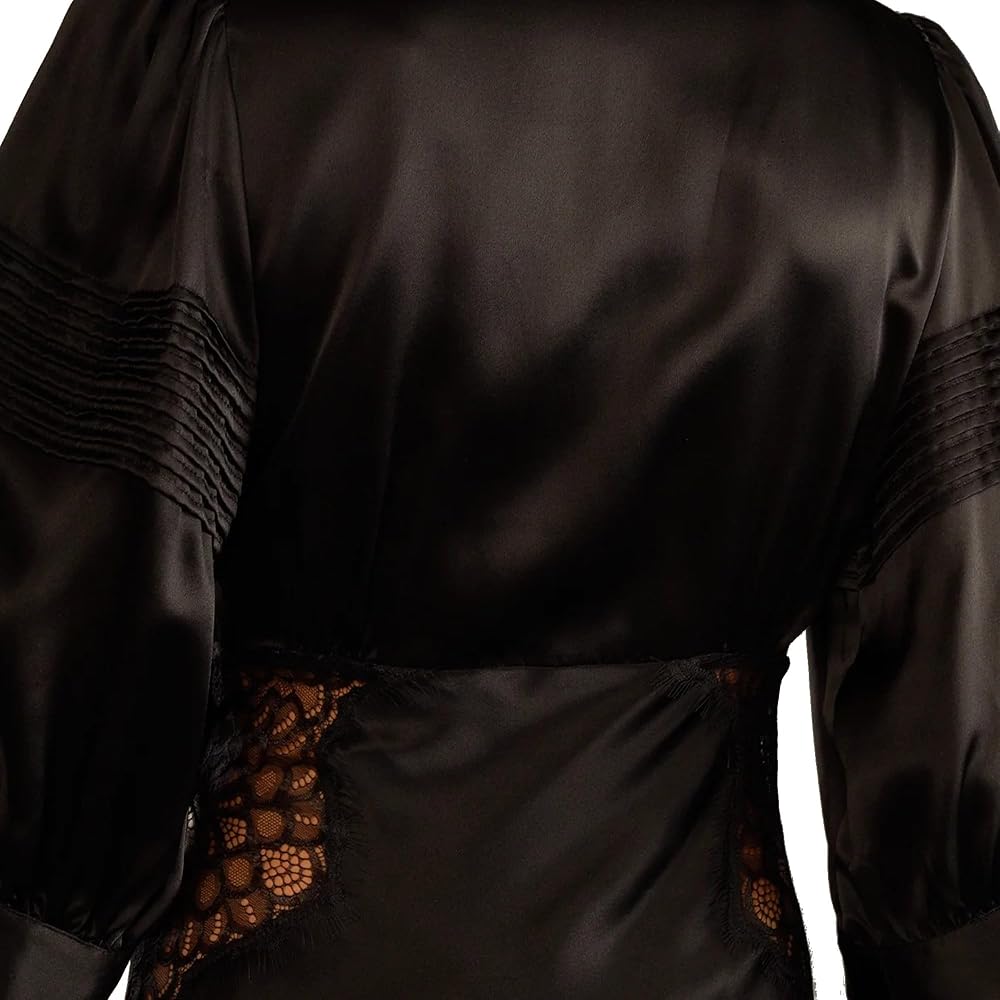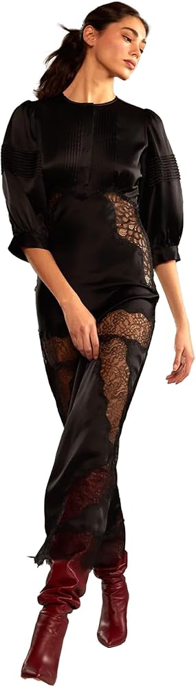 - Lustrous silk with intricate lace that adorns the waistline, hem, and hip