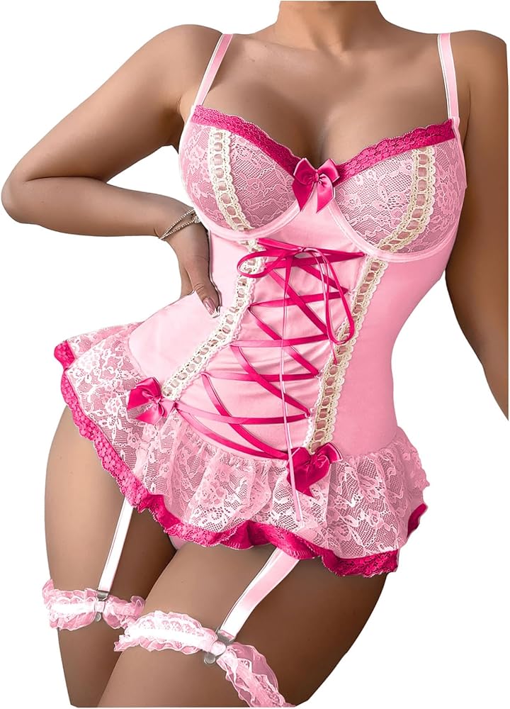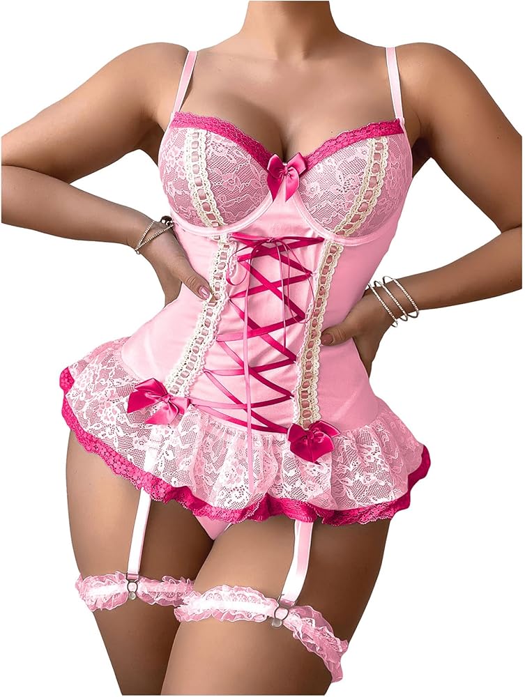 Features:lace-up front, bow decor, contrast lace, lingerie garter set