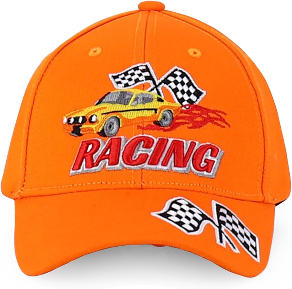 RACING in 3D with flame car and race flags is embroidered on the front