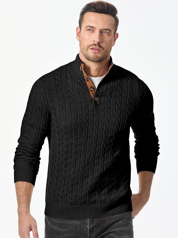 Unique Design: Casual sweater for men features button-up neck, stand collar, chunky warm, basic simple design. The collar and elbows are accented with suede patches, and it includes high-quality button closures.