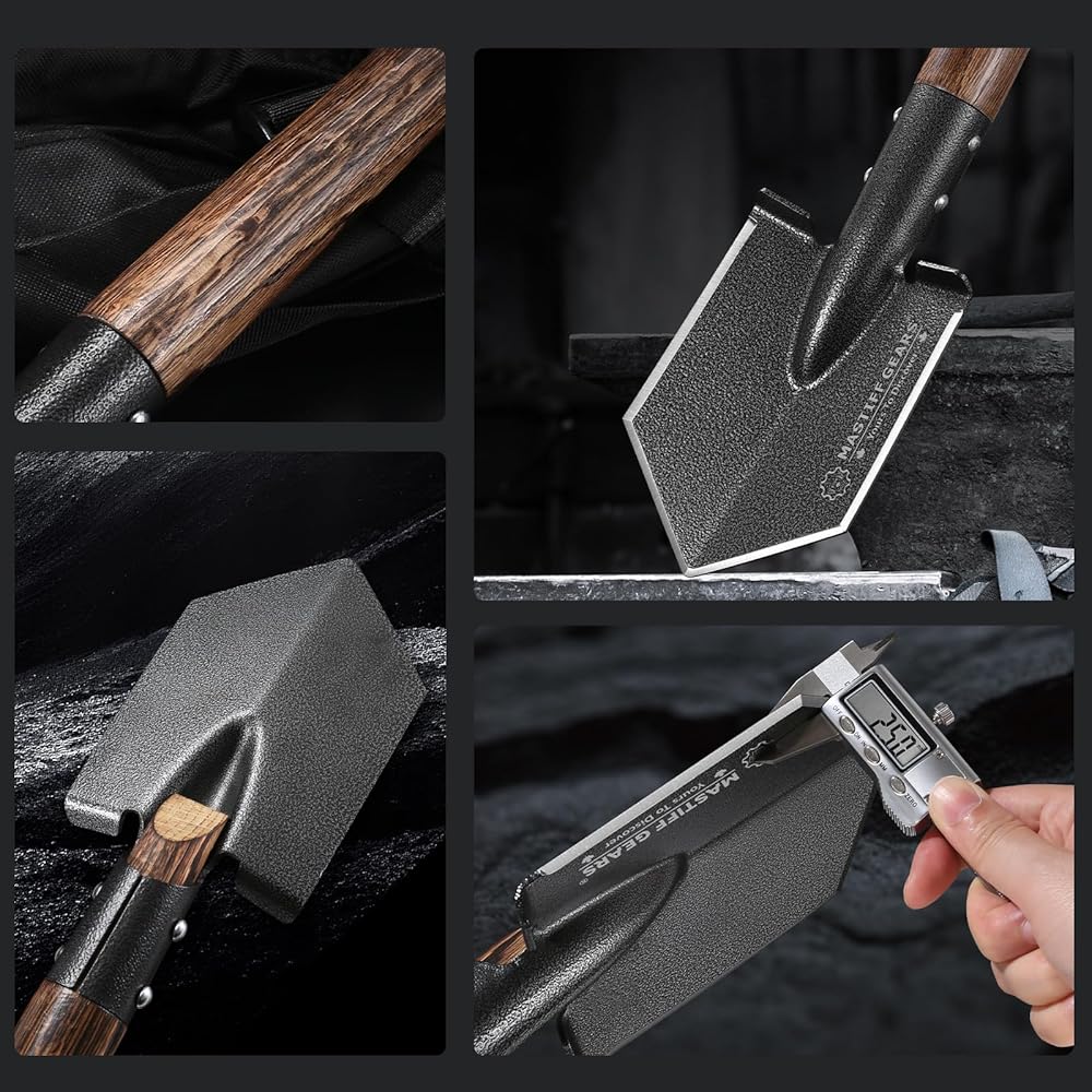 🐶 The shovel head is made of hardened #1065 carbon steel, with 1.8 mm thickness and 15cm * 20cm size, one of the biggest you can find among camping shovels. We quench forged 1065 steel sheet to around HRC 60, and then further temper it to HRC 49-53 for better toughness.