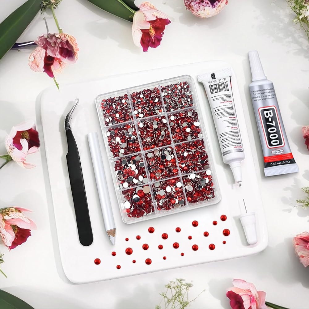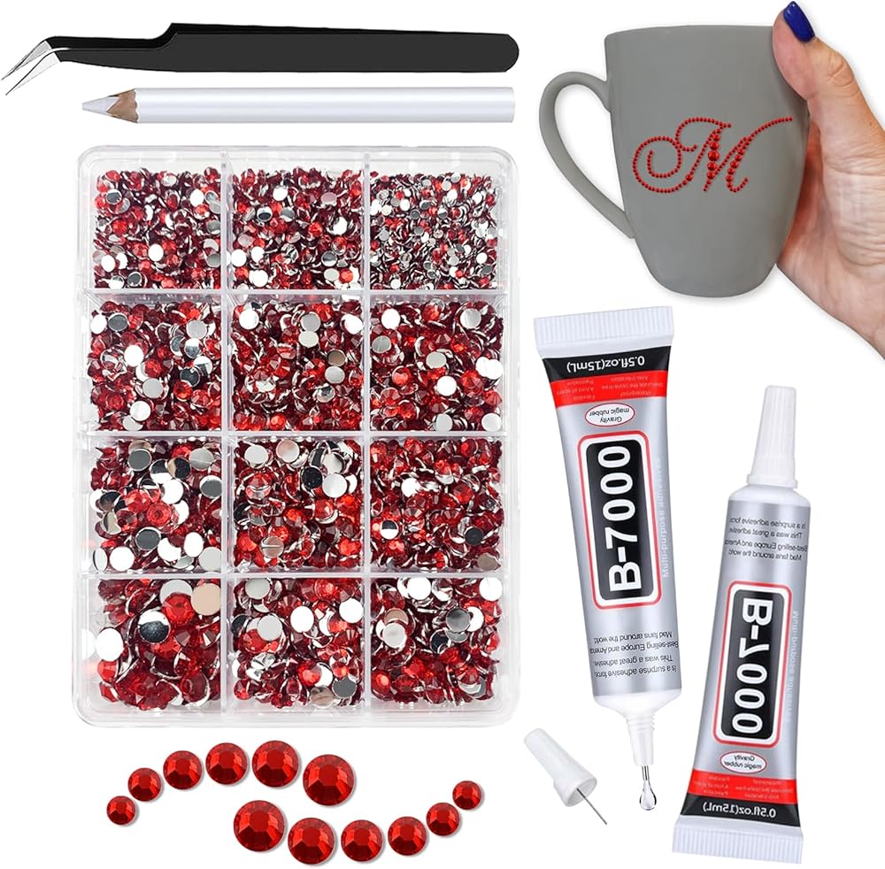 Bling Rhinestones Glue Kit for Crafts: B7000 Clear Glue Gemstones Set for Clothes Shoes Jewels - Flatback Diamond for Tumblers - Resin Gems Stones for Nails (Silver Red)