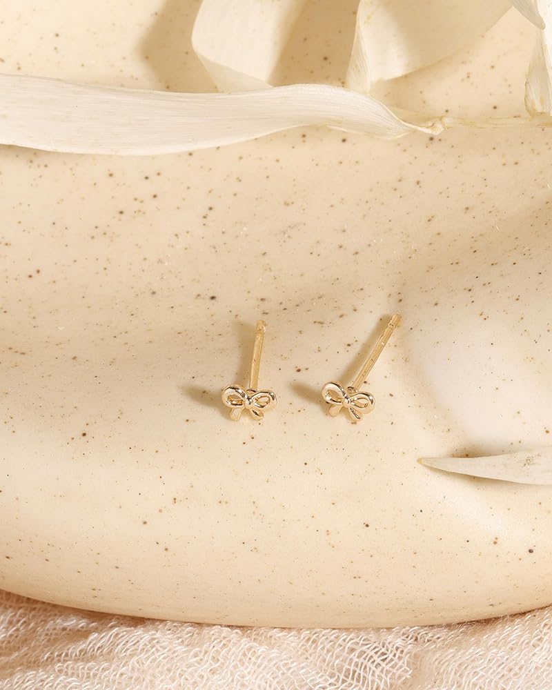 Gold Earrings:Add a touch of playful elegance to your look with our 14K Gold Mini Bow Stud.The dainty bow feature adds a charming detail.