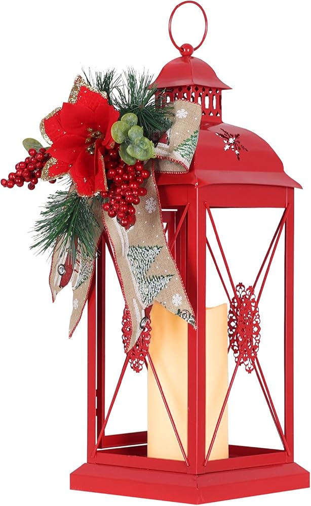 DECORKEY Christmas Decorations, 18" Metal Christmas Lantern with LED Candle and Floral Accents for Home Decor, Decorative Hanging Candle Holder Indoor Outdoor for Table Centerpieces, Porch, Patio