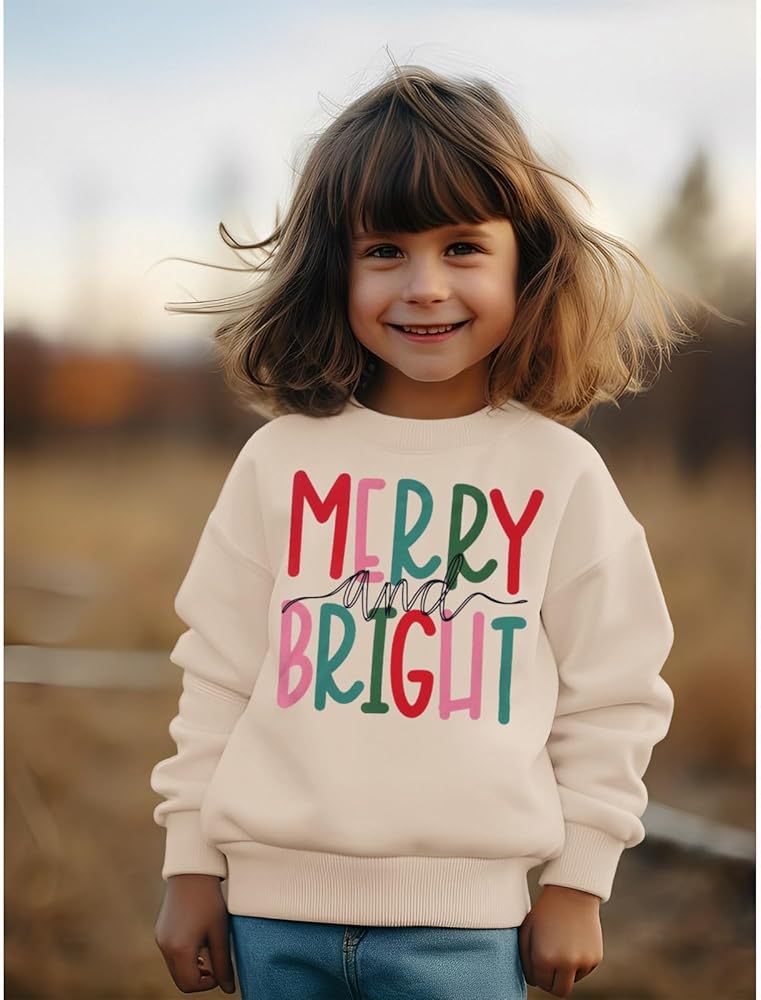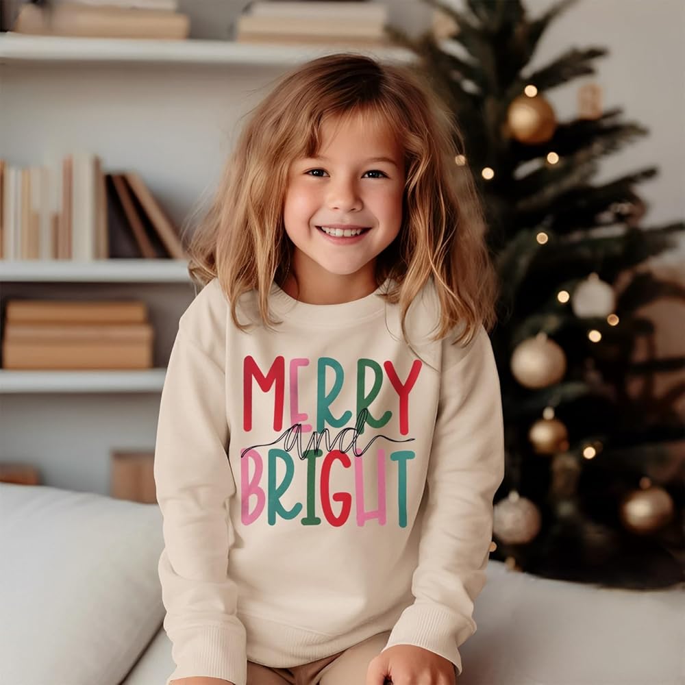 🎄Material: This super cute big kid's Xmas sweatshirt is made of cotton-polyester blend fabric. Comfortable and breathable Merry and Bright graphic sweatshirt no harm to your kid's delicate skin.