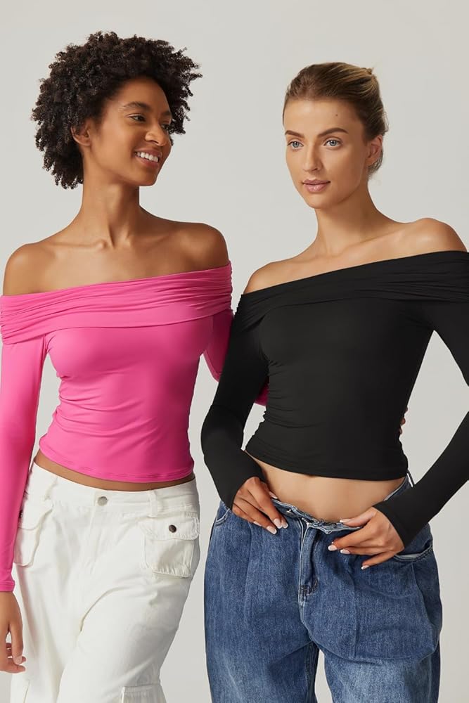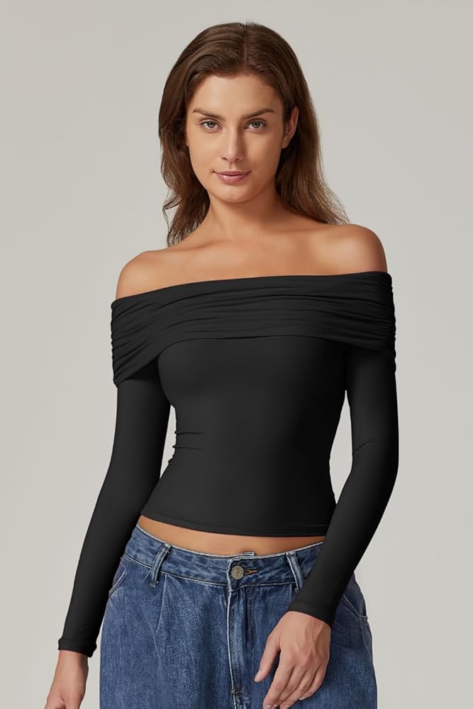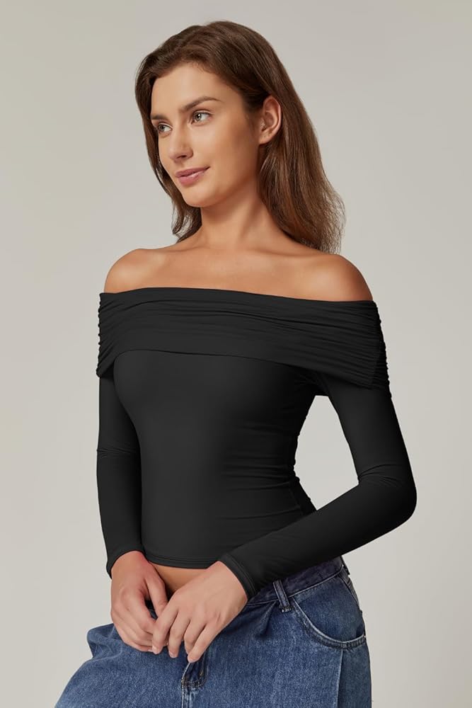 Elegantly Minimalist Design: Ideal for day-to-night styling,this long sleeve crop top features a slim fit and a folded off shoulder look with a gathered side seam, which elegantly shows off your shoulders and sexy collarbones