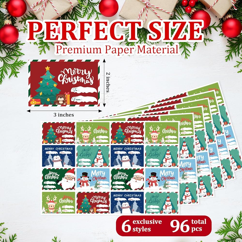 【Package Includes】Each set contains 6 sheets (96 pieces total) Christmas name tags stickers in 6 different designs. Sufficient quantity and various styles. Each gift tag labels measures 2 x 3 inches, with plenty of space to write the names of the recipient and gift giver.