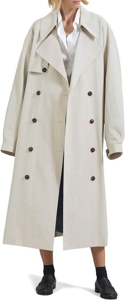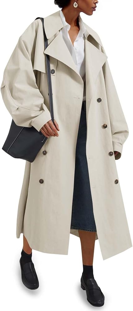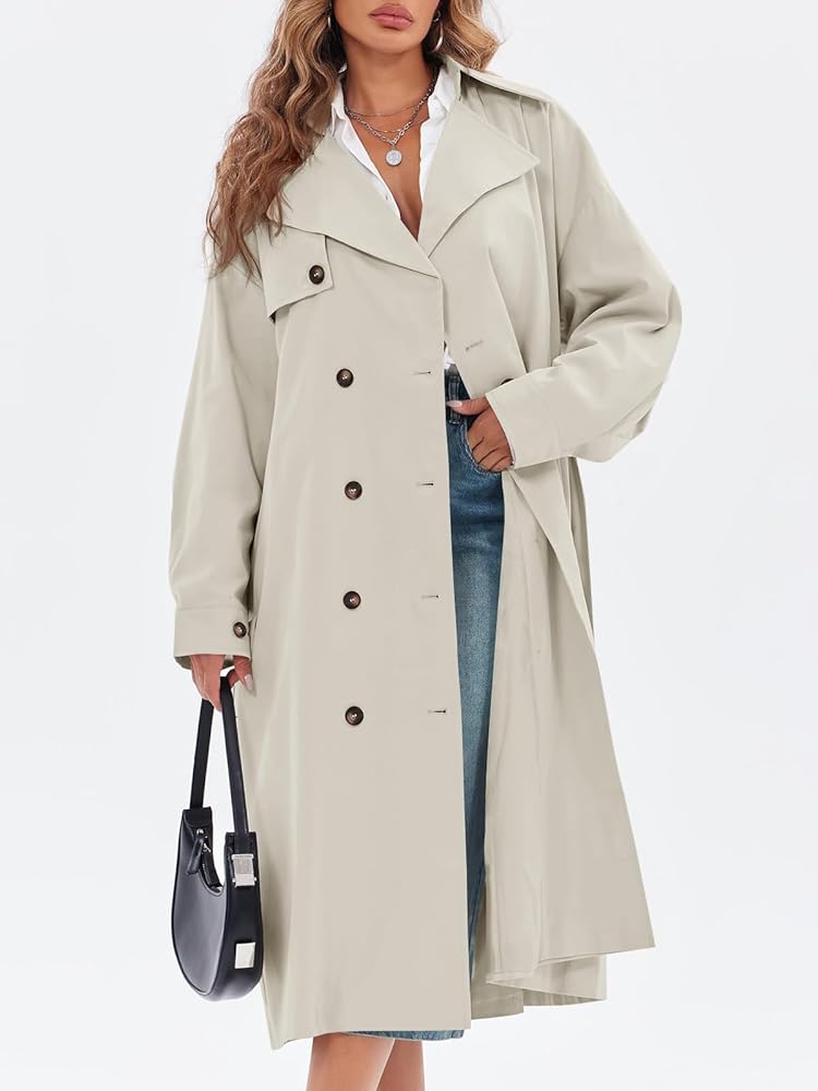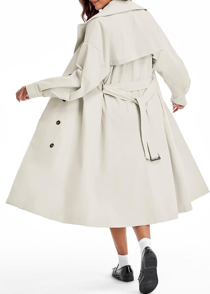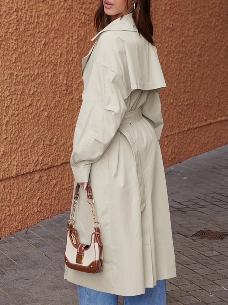 Tankaneo Womens Double Breasted Long Trench Coat Oversized Classic Lapel Belted Overcoat