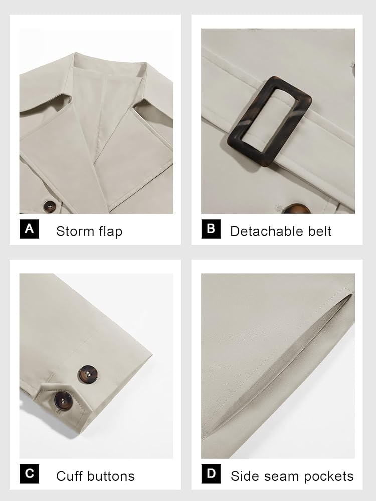 - Classic Design: Long double-breasted front button closure, notch lapels, storm flap, belt tied back or make a bowtie around the waist.
