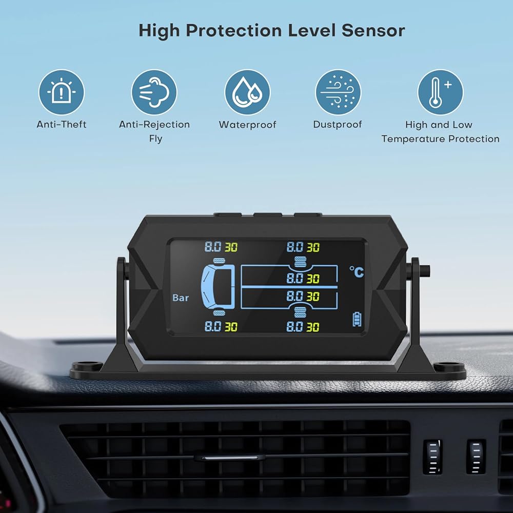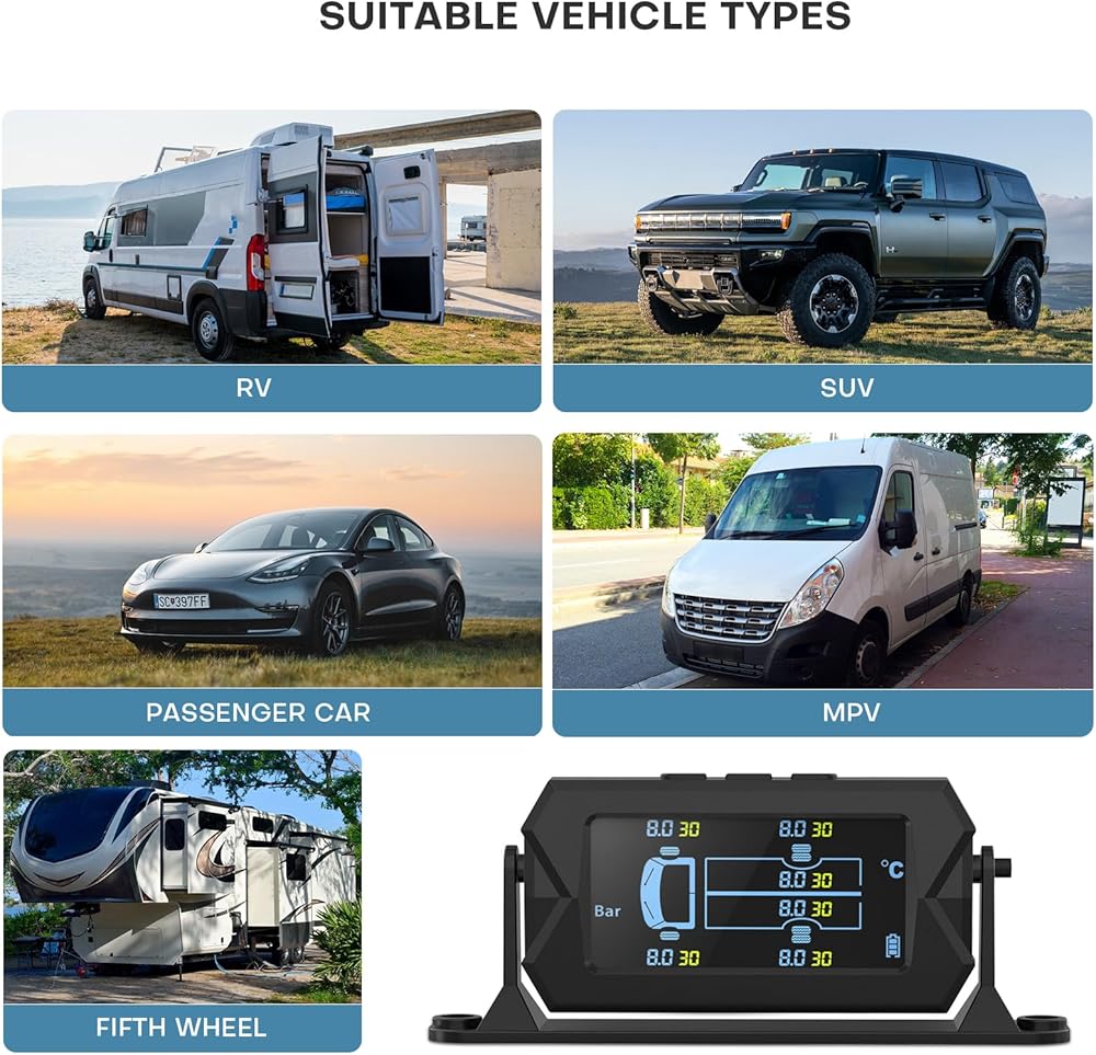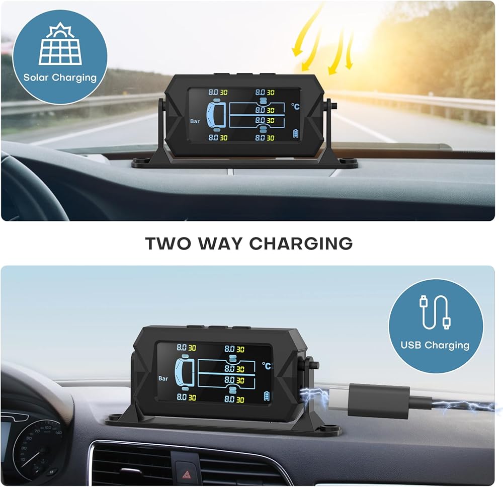【Solar Charging and USB Charging】: The Tire Pressure Monitoring System offers two convenient charging options. Equipped with a solar lithium battery panel, it autonomously charges under sunlight, ensuring continuous battery life. Additionally, it can be supplemented by USB Type C charging when sunlight is unavailable. These dual charging methods enhance the Tire Pressure Monitoring System with 6 External TPMS Sensors, extending its standby time for prolonged usability.