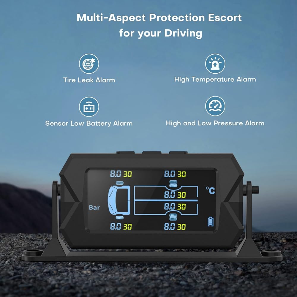 【Real-time Monitoring & Easy Setup】: Explore Five Alarm Modes and Easy Setup for Alarm Thresholds With the Tire Pressure Monitoring System, you'll unlock five unique alarm modes, including fast leak detection, high/low-pressure alerts, high-temperature warnings, and sensor low voltage notifications. Upon pairing, the system effortlessly sets the current pressure as the reference point, simplifying the configuration of alarm thresholds.