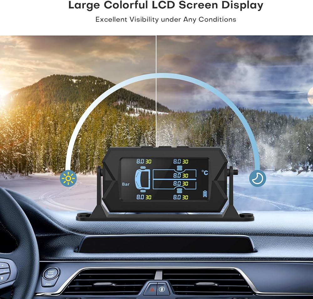 【Upgraded Color LCD Display and Live Monitoring】: The Tire Pressure Monitoring System features an intelligent Color LCD screen that automatically adjusts backlighting in varying light conditions, ensuring clear data display. With real-time monitoring capabilities, it provides simultaneous display of data from all 6 sensors, allowing drivers to easily access tire pressure and temperature information whenever needed.