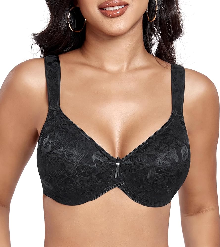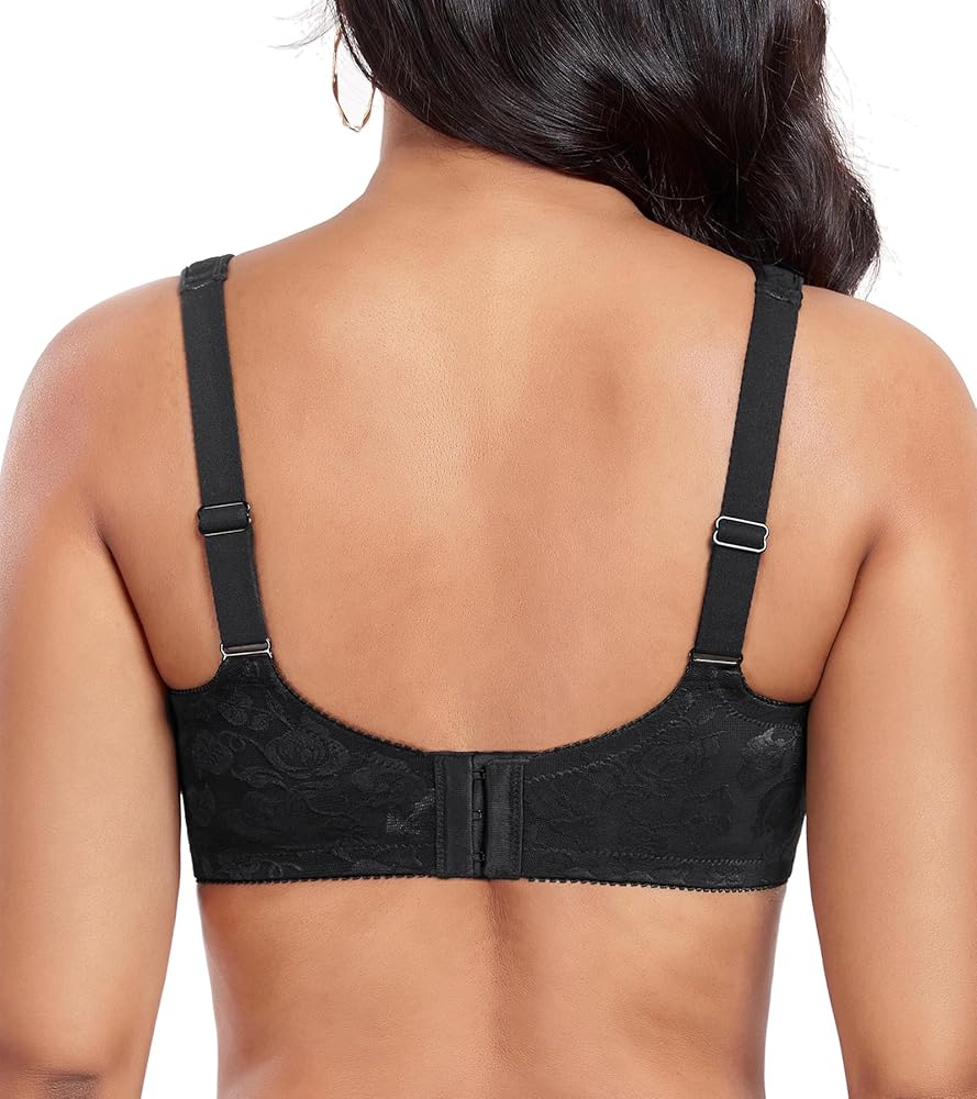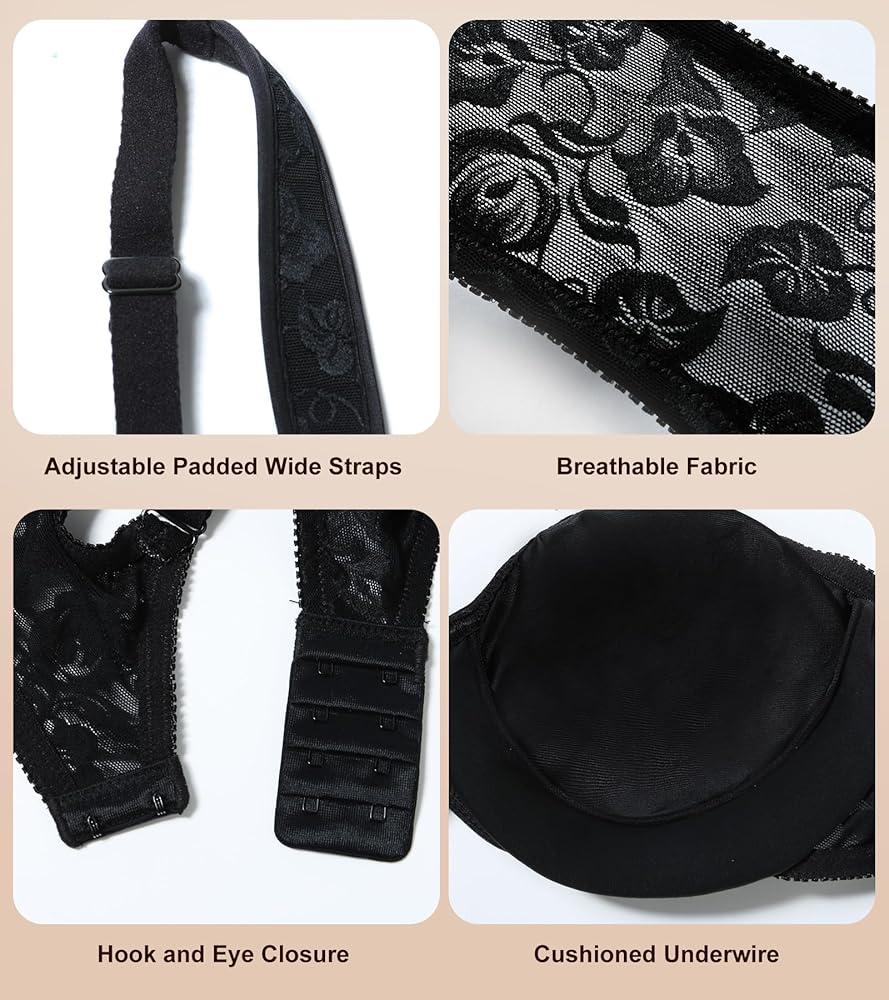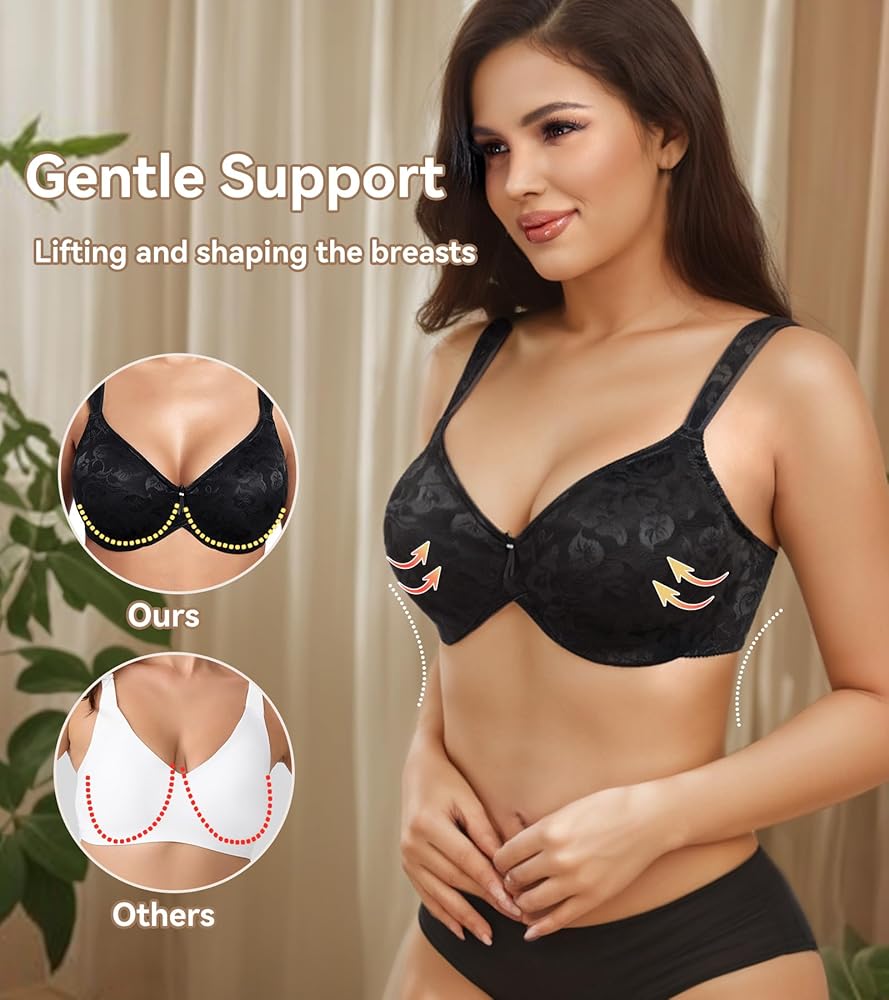 Elegant Design: The cups are adorned with an elegant print, while the Y-neckline perfectly complements low-cut tops. This underwire bra offers an elegant and fashionable wearing experience, making it perfect for a comfortable everyday bra. Multiple sizes available, even plus size for large breasted women.