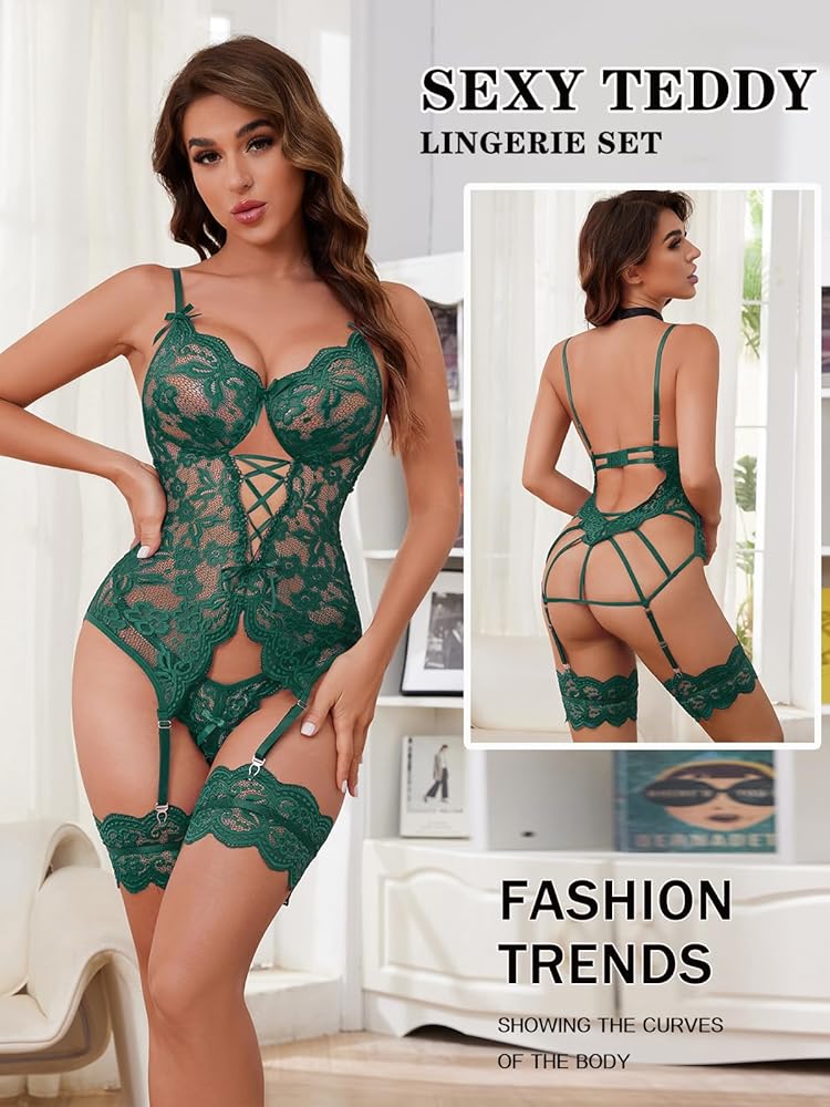 ✿Pakacge Content:1 X Women Lace Bodysuit with Garter Belts & 1x panty & 1pair thigh cuffs.(Not included the leg stockings)