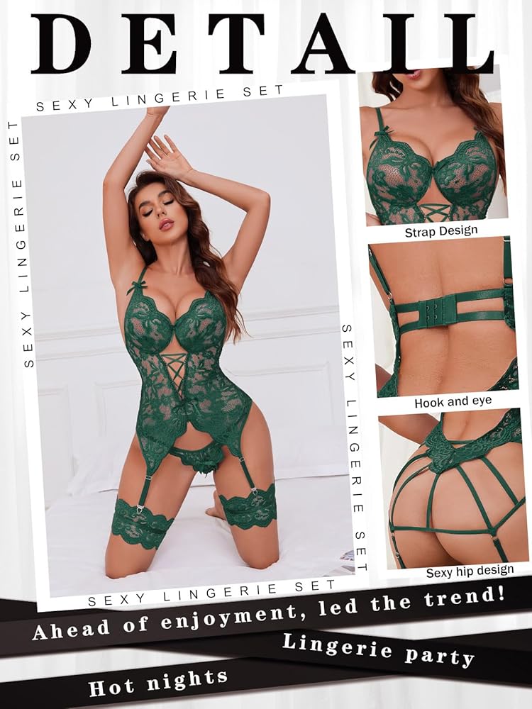 ✿Features: Delicate lace adorns the bustier while satin bow accents playfully accentuate the female form. Women's lingerie set features deep v front, floral lace, adjustable straps, backless design.