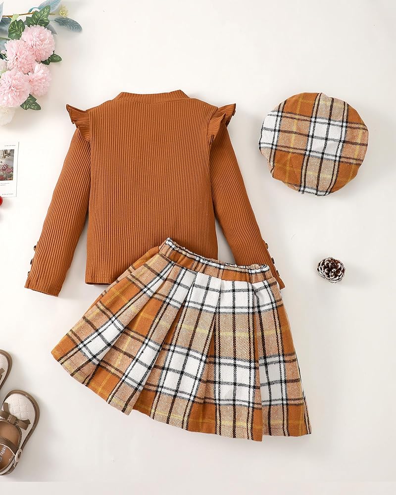3 Pieces Girl Outfit Set: The girl clothing set include 1*long sleeve shirt + 1* ruffle pleated skirt + 1*matching hat. There has multiple color for your choice, brown plaid skirt set, blue plaid dress set, puff sleeve shirt red plaid skirt set for girl, black plaid skirt, ruffle orange skirt set and etc.