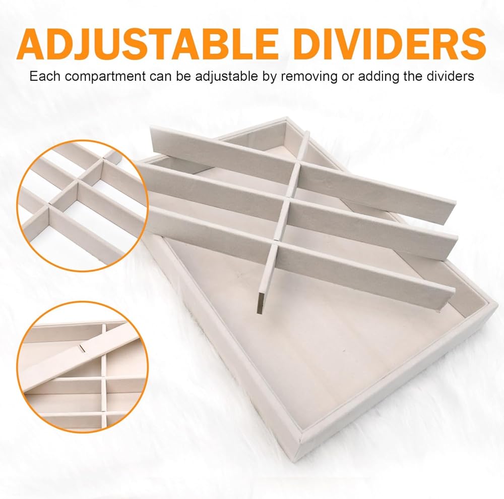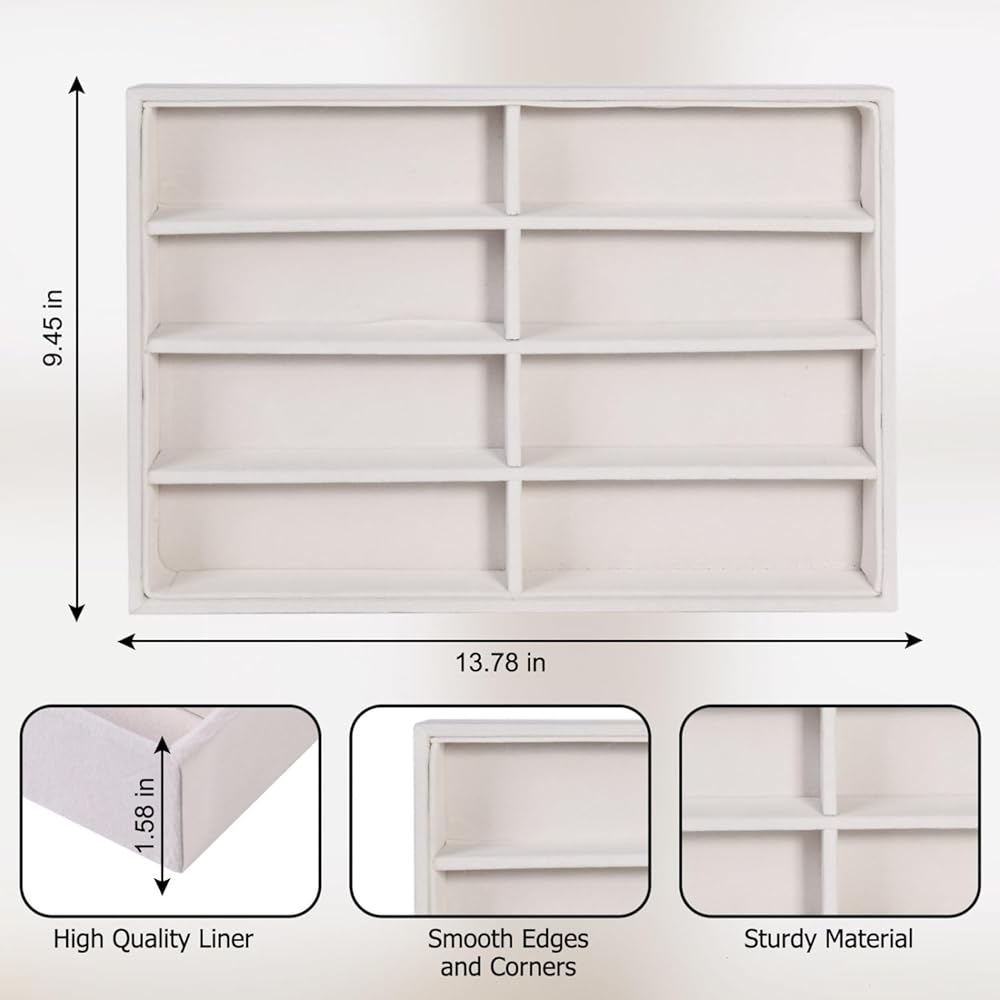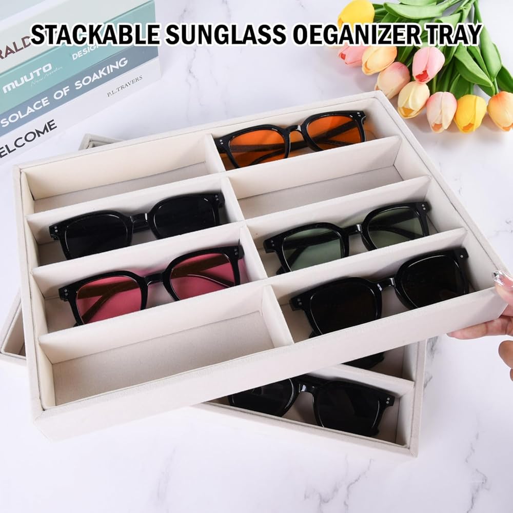 PREMIUM SUNGLASS ORGANIZER: The sunglasses drawer organizer size is 13.78" x 9.45" x 1.58", there are 8 grids in total, and the single grid size is: 6.5" x 1.97". The outer layer is soft velvet, which can protect your items well Free from scratches.