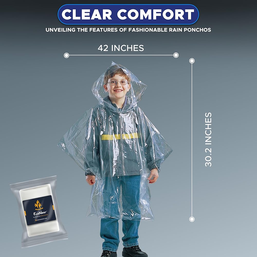 **ULTIMATE PORTABILITY:** Our clear rain ponchos for Kids, including clear rain ponchos for Boys and Girls, are individually wrapped and compact. Slip an Kids rain poncho with a hood into your bag or pocket for on-the-go protection without sacrificing space or style. Whether you need disposable rain ponchos for kids or a toddler friendly rain panchos, our products are designed for maximum convenience.