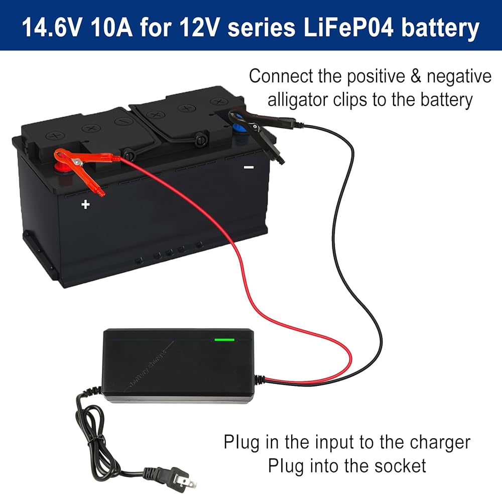 14.6V 10A LiFePO4 Battery Charger for 12V Lithium Battery(10Ah-100Ah), Smart Battery Charger/Maintainer, 3-Stage Fast Charging, Built-in Full Protections for Lithium Iron Phosphate Batteries