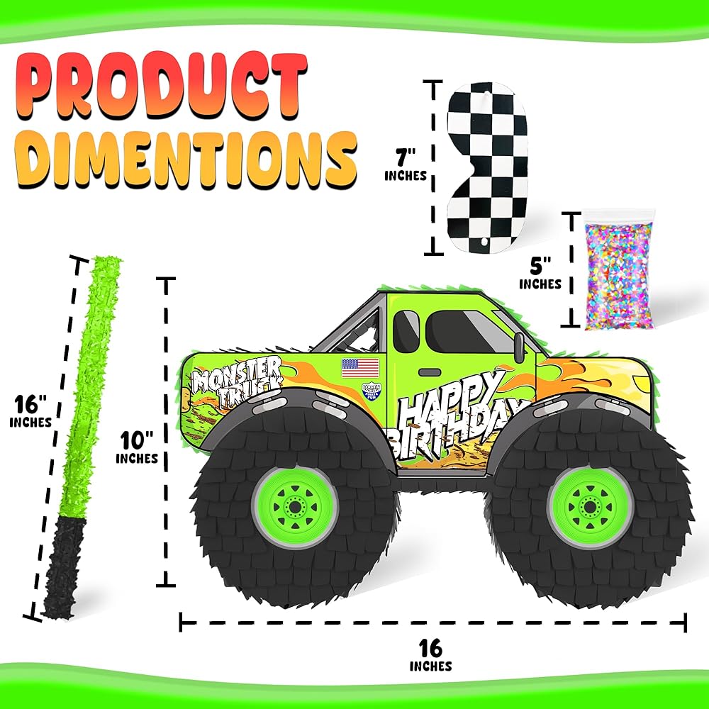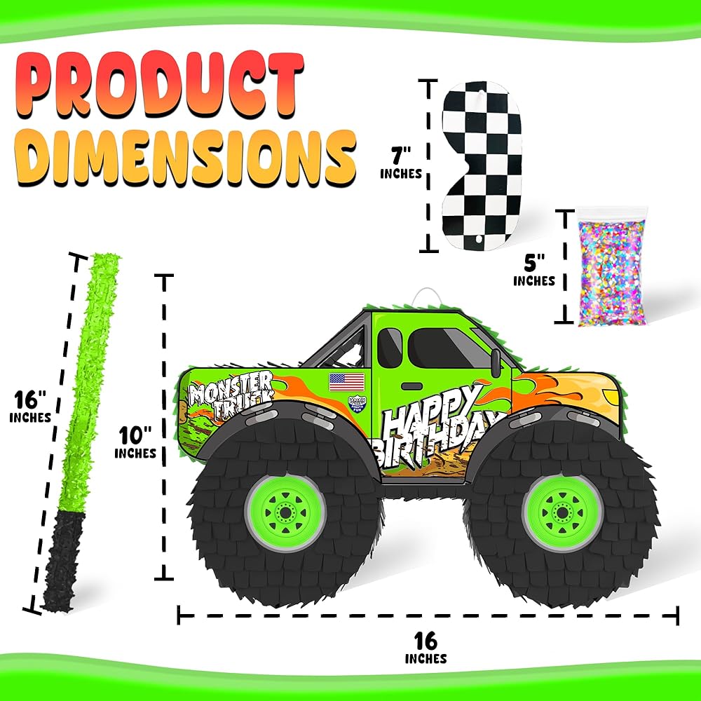 Get ready to add some high-octane excitement to your next celebration with our Monster Truck Piñata! This incredible 4-piece set is the perfect addition to any kids' party, Monster Truck-themed celebration, or any other event where you want to add some fun and excitement. Our Monster Truck Piñata measures approximately 17x10x4 inches and can hold up to 3lbs of candy and party favors. It comes complete with a small wooden stick, a blindfold, and a small multicolored confetti bag. With its eye-catching design and fun-filled features, our Monster Truck Piñata is sure to amaze your guests and provide endless entertainment as they try to break it open. Our Monster Truck Piñata is built to last and can withstand multiple hits.