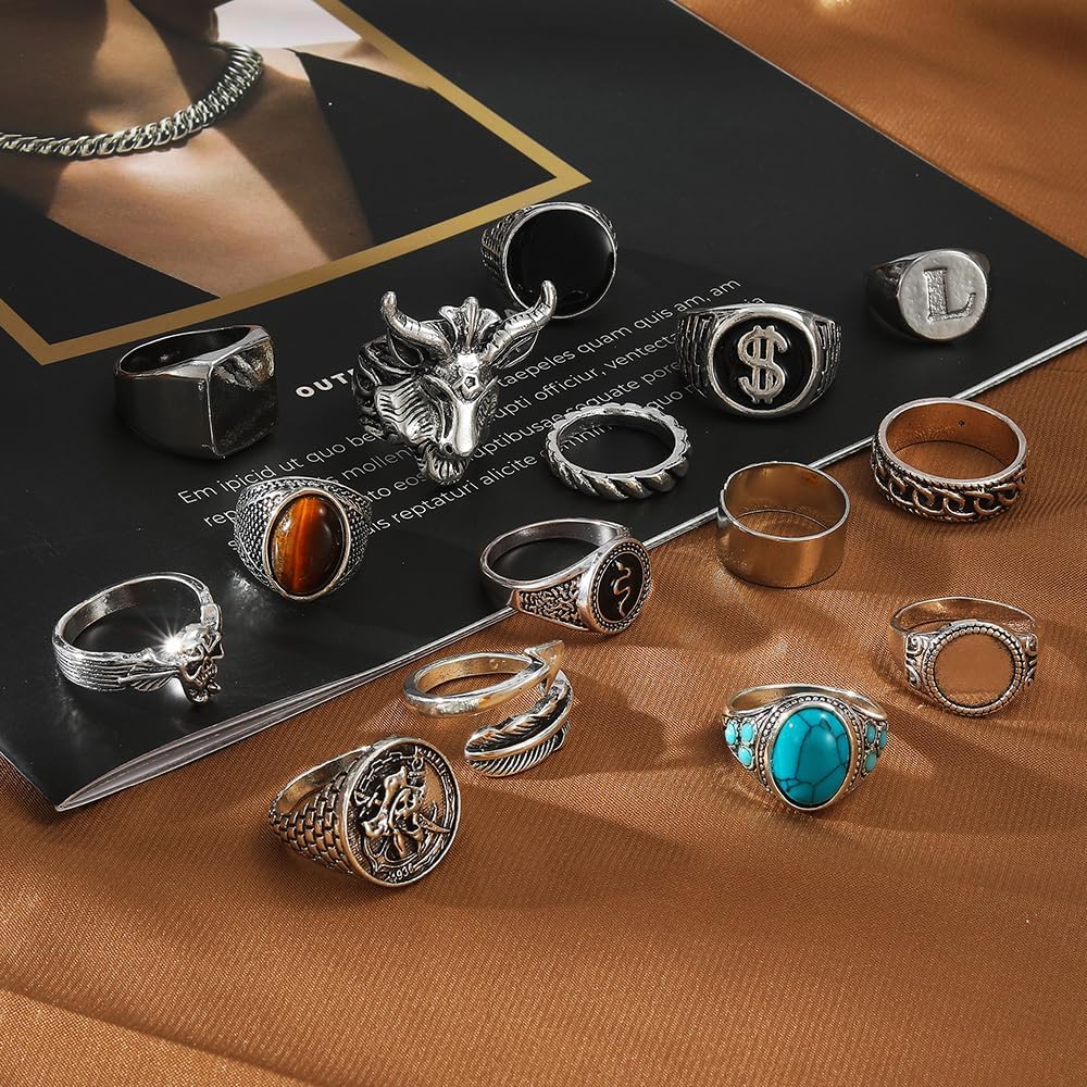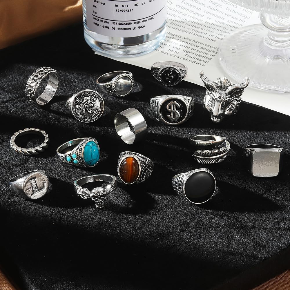 KISS WIFE Vintage Silver Punk Rings Set for Men, Cool Gothic Chunky Rings Bulk, Skull Snake Spade Ace Malachite Stackable Hippie Knuckle Rings Pack, Trendy Men's Jewelry Gift for Him