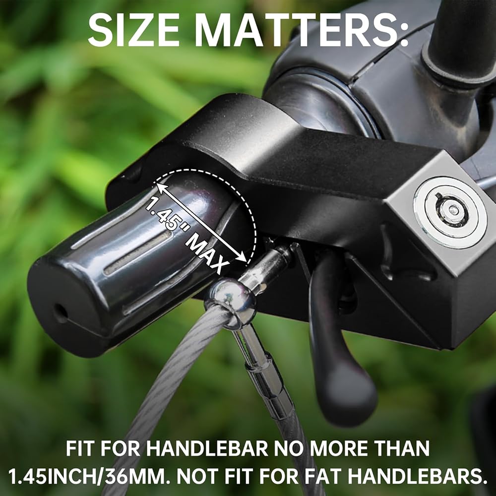 Application Scope: Our anti theft motorcycle locks are suitable for handlebar diameter is no more than 1.4 inches, NOT FIT FOR FAT handlebar, with durable rubberized handle ensures no scratches. Can easily fit on Motorcycles, Sports Bikes, Scooters, Mopeds & ATV's