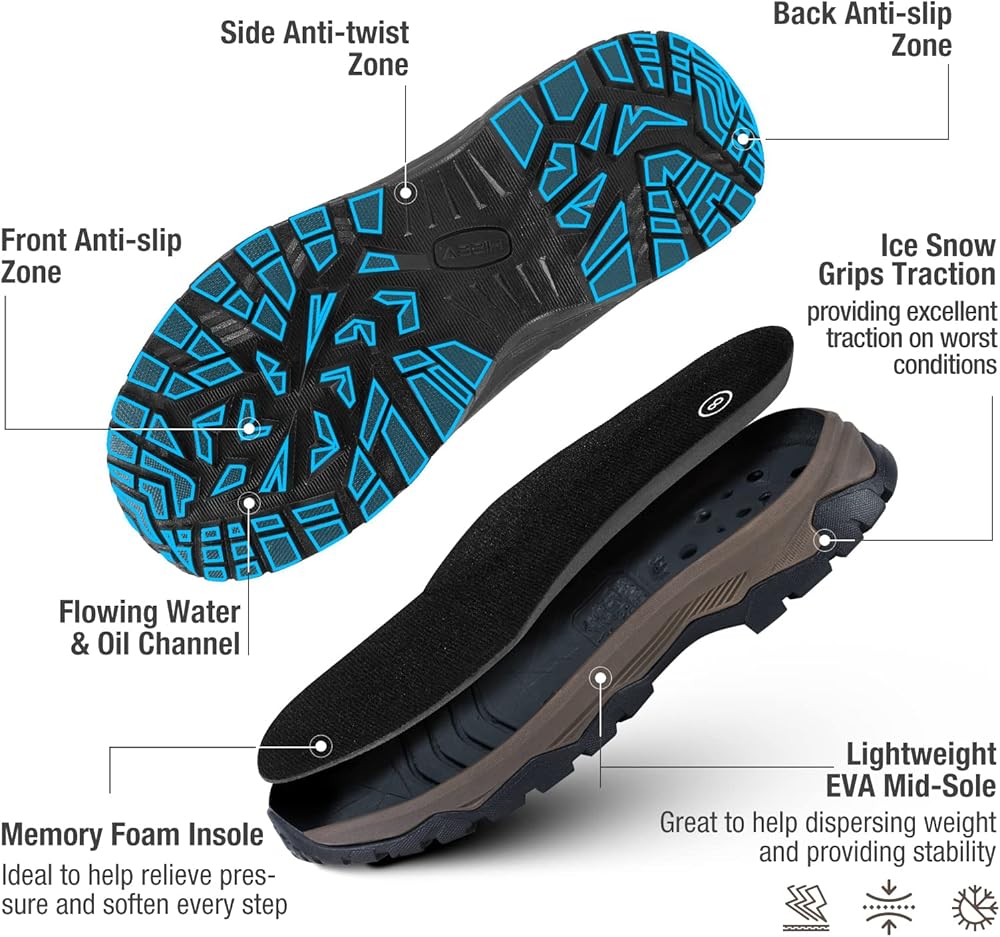【Anti-Slip and Ice Snow Grips Traction】Durable molded outsoles provide excellent stability and solid traction on a variety of terrain, ice, snow and other worst conditions, slip-resistant and self-clean. Reinforced rubber shell extends up above ankle and adds additional protection on the toe and heel.