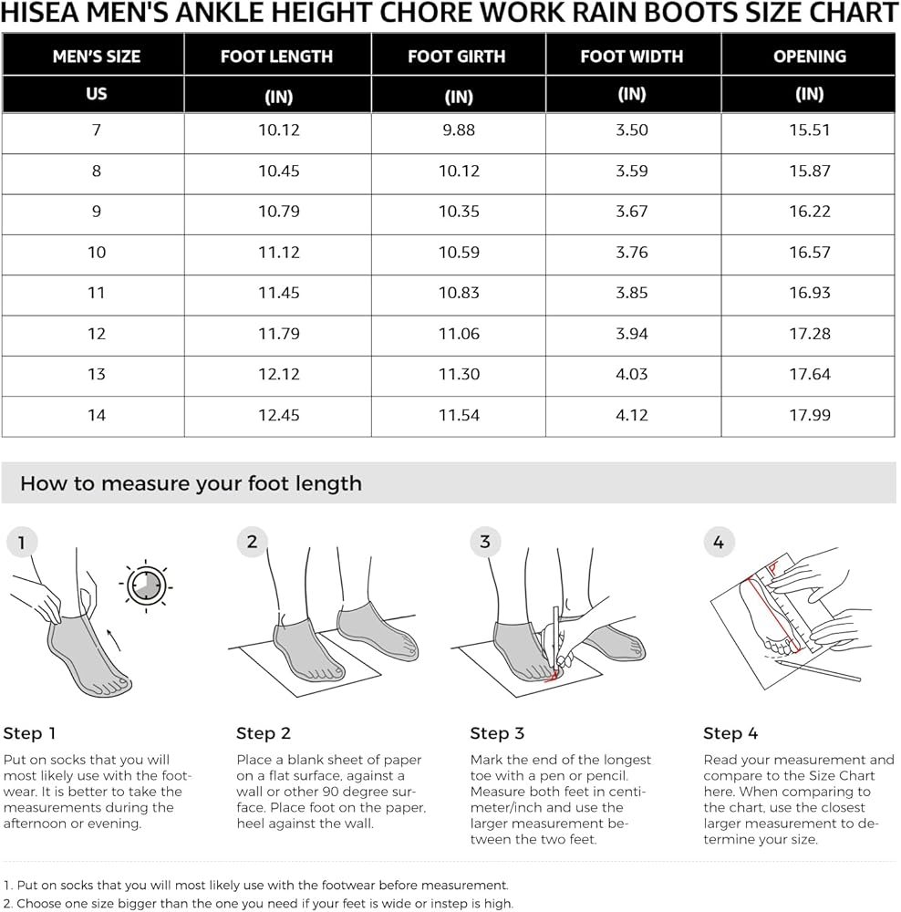 【Durable and User-Friendly】HISEA Excursion Pro Men's Rain Boots have been upgraded in performance and quality, more durable than normal rain boots. The pull-on tabs at the back and kick plates help you put on and off with ease. Elastic shoe mouth and ankle height provide good flexibility to fit your foot shape.